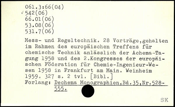 Mess- und Regeltechnik. 28 Vorträge,gehalten im Rahmen des europäischen Treffens für chemische Technik anlässlich der Achema-Tagung 1958 und des 2,Kongresses der europäischen Föderation für Chemie-Ingenieur-We-sen 1958 in Frankfurt am Main. Weinheim 1959