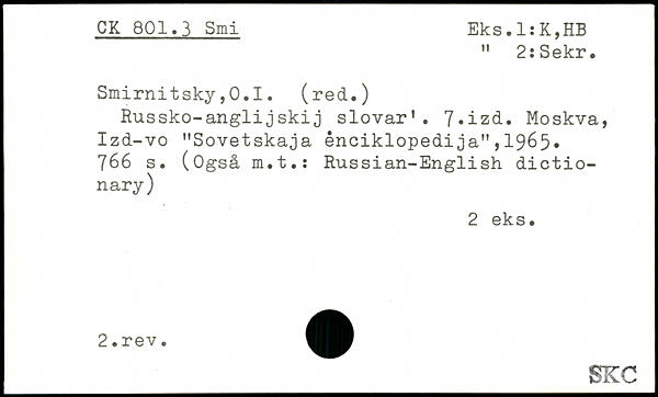 Smirnitsky,0.1. (red.) Russko-anglijskij slovar'. 7.izd. Moskva, Izd-vo "Sovetskaja ênciklopedija",1965.