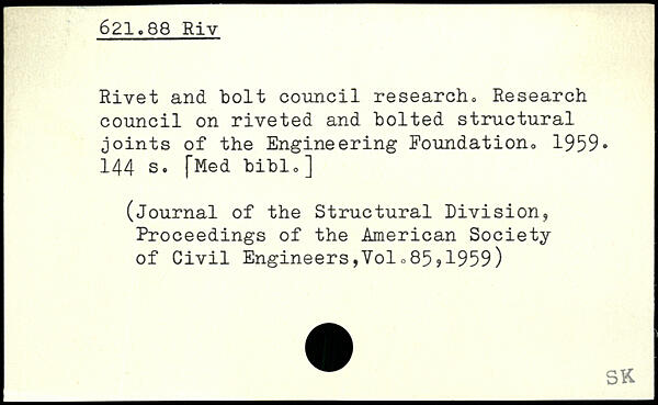 Rivet and bolt council research. Research council on riveted and bolted structural joints of the Engineering Foundation. 1959