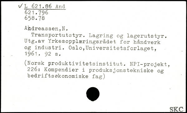 Transportutstyr. Lagring og lagerutstyr. Utg.av Yrkes opplserings rådet for håndverk og industri.