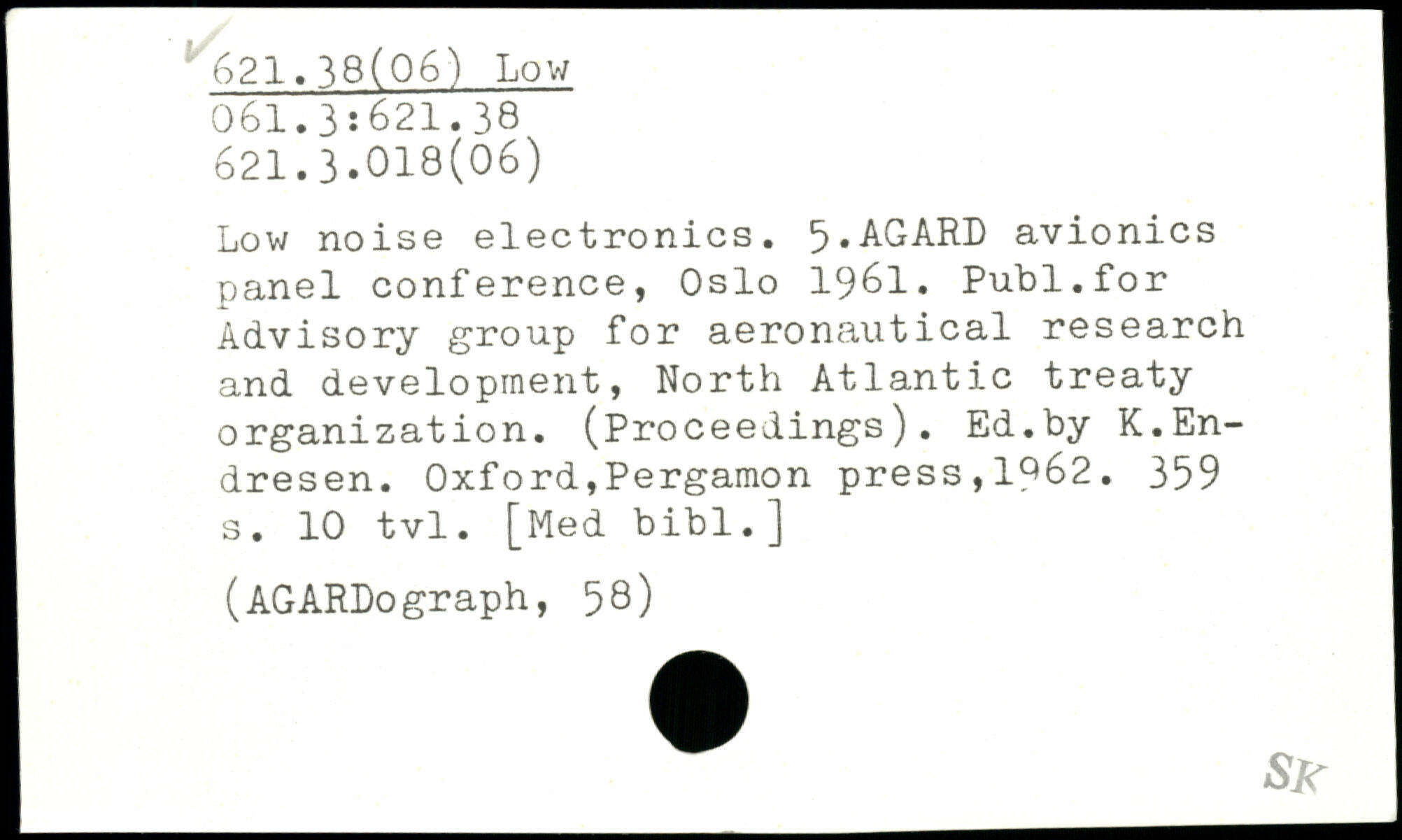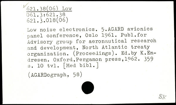 Low noise electronics. 5.AGARD avionics i panel conference, Oslo 1961. Publ.for Advisory group for aeronautical research and development, North Atlantic treaty organization. (Proceedings). Ed.by K.En-dresen. Oxford,Pergamon press,1?62.