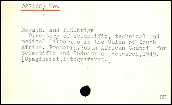 Directory of scientific, technical and medical libraries in the Union of South Africa. Pretoria,South African Council for Scientific and Industrial Research,1949. [Upagineret,litograferet.]