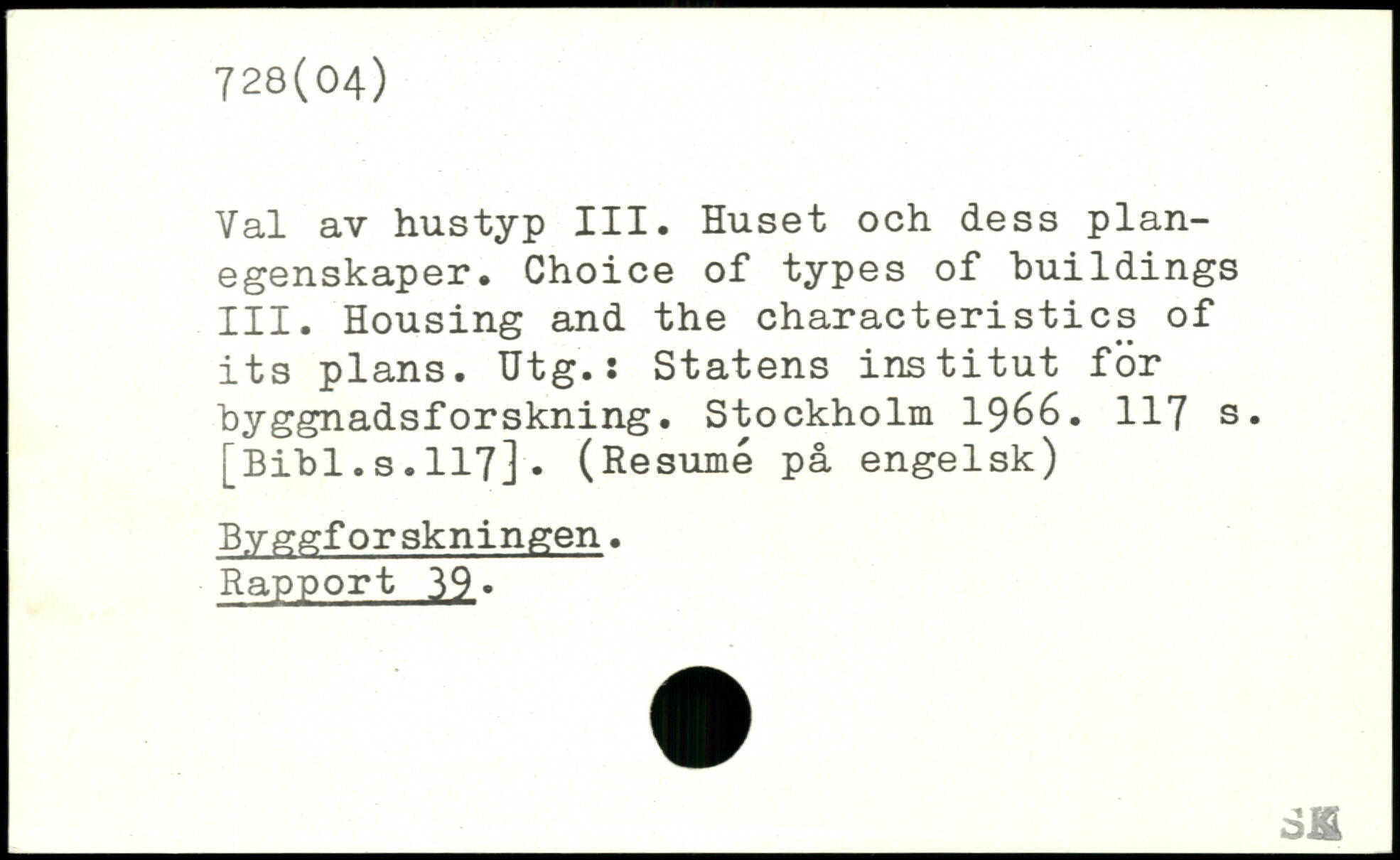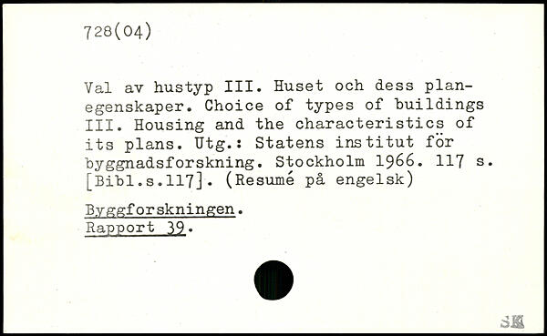 Yal av hustyp III. Huset och dess planegenskaper. Choice of types of "buildings III. Housing and the characteristics of its plans. Utg.: Statens institut for hyggnadsforskning.