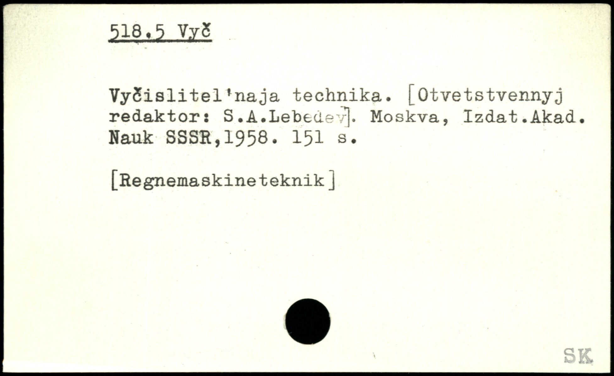 ,8j5-Iz£ VySislitel.naja technika. [Otvetstvennyj redaktor î S .A.Lebedev]. Moskva, Izdat.Akad. Nauk SSSR,1958.