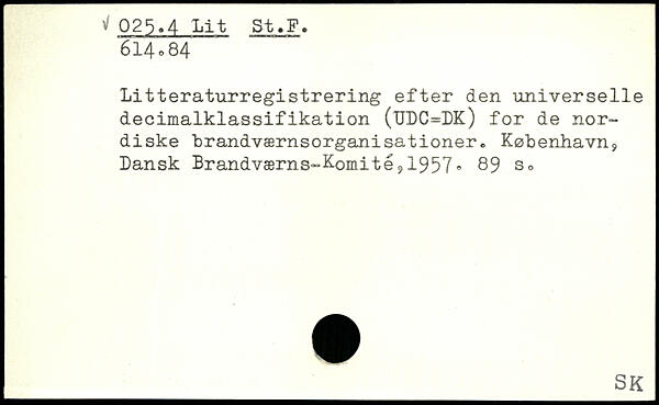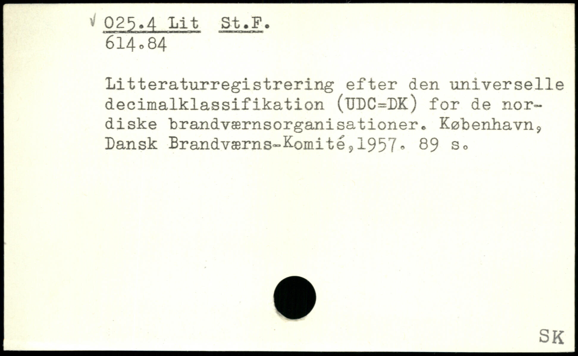 Litteraturregistrering efter den universelle decimalklassifikation (UDC=DK) for de nordiske brandværnsorganisationer. København,? Dansk Brandværns-Komité,1957
