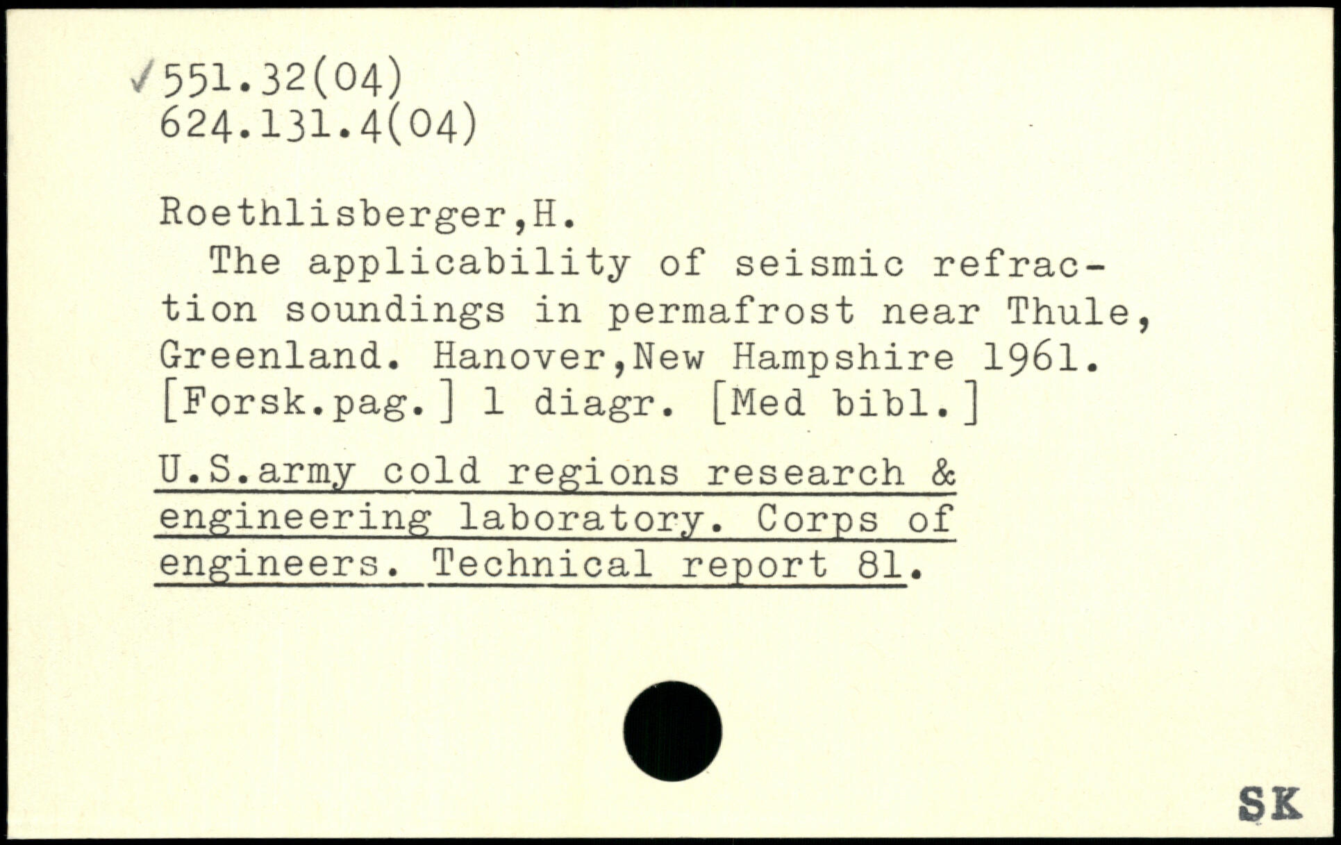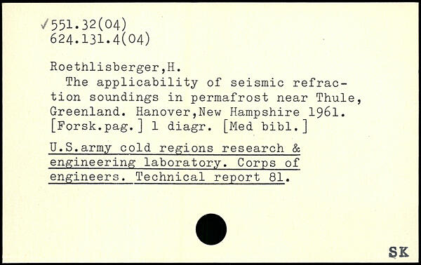 The applicability of seismic refraction soundings in permafrost near Thule, Greenland. Hanover,New Hampshire 1961. [Forsk.pag.] 1 diagr. [Med bibl.] U.S.army cold regions research & engineering laboratory. Corps of engineers. Technical report 81.