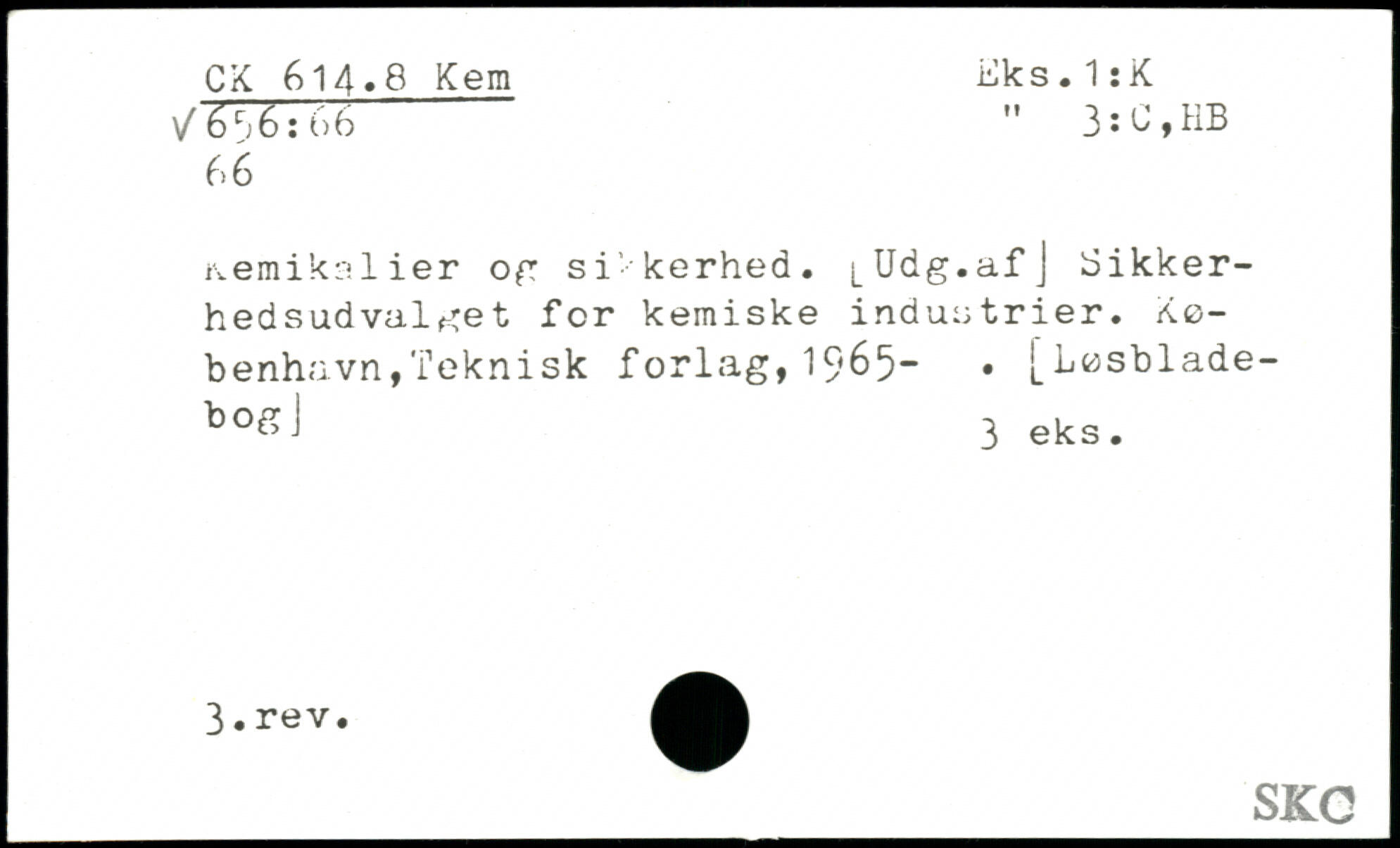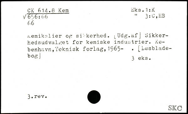 ivemikalier og si kerhed. [Udg.afJ Sikkerhedsudvalget fer kemiske industrier, kø-benhavn,Teknisk forlag,1965". [Løsblade- bosJ 3 eks.