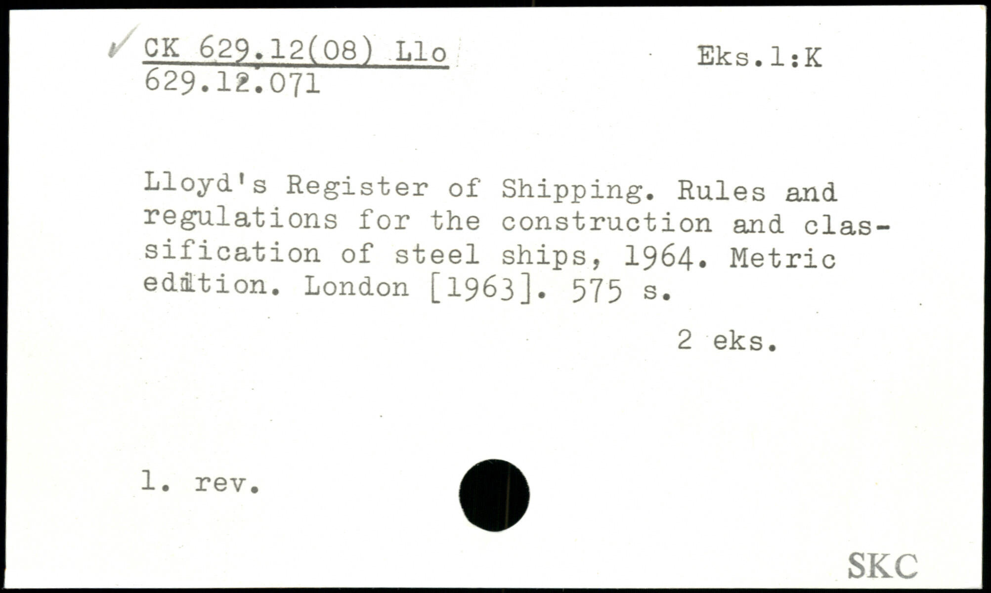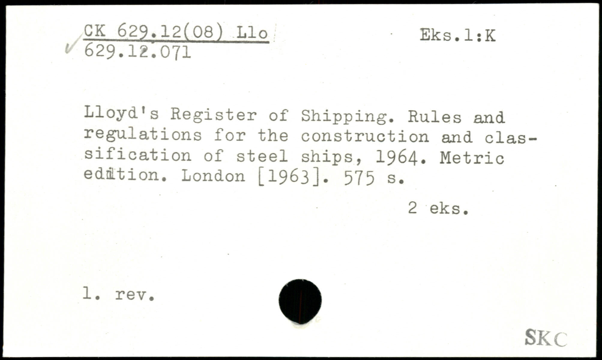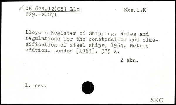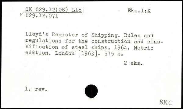 Lloyd's Register of Shipping. Rules and regulations for the construction and classification of steel ships, 1964. Metric edition.
