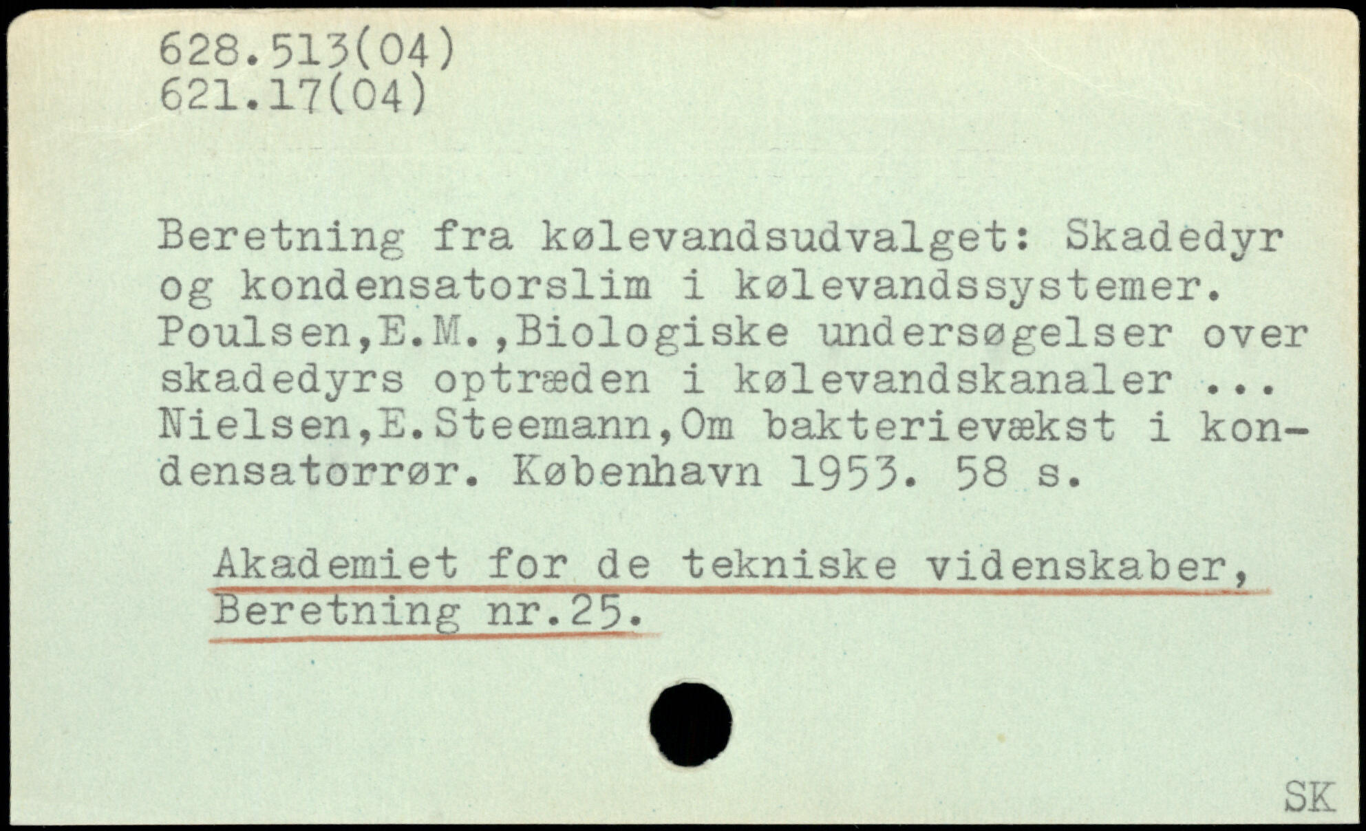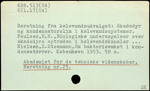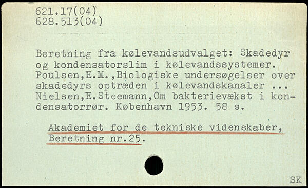 Beretning fra kølevandsudvalget: Skadedyr og kondensatorslim i kølevandssystemer. Poulsen,E.M.,Biologiske undersøgelser over skadedyrs optræden i kølevandskanaler ... Nielsen,E.Steemann,Om bakterievækst i kondensatorrør.