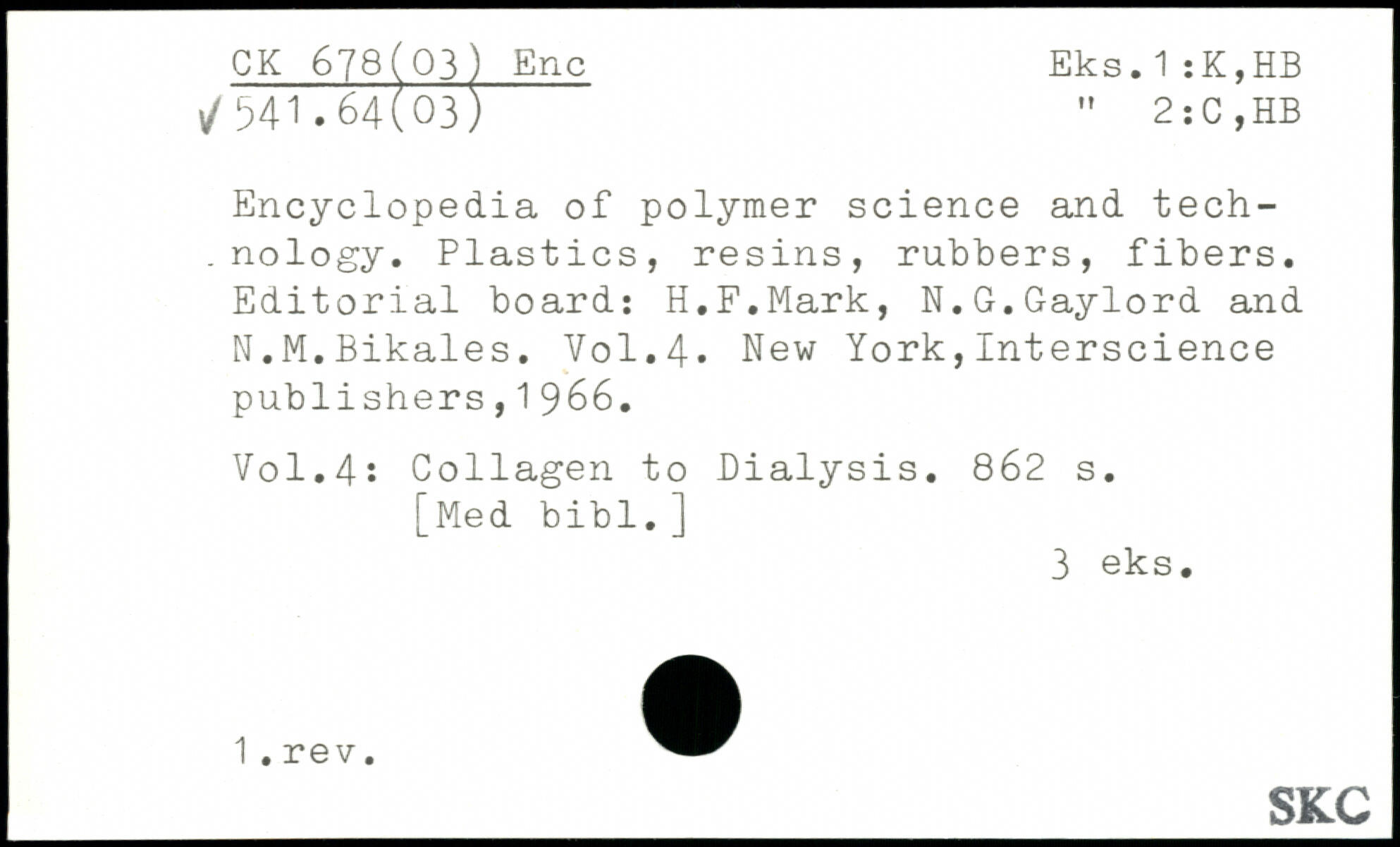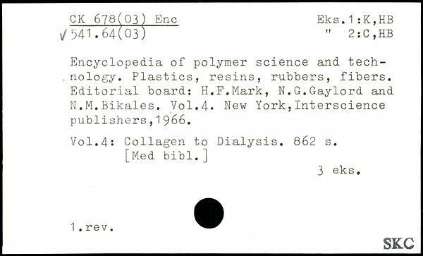 Encyclopedia of polymer science and tech-. nology. Plastics, resins, rubbers, fibers. Editorial board: H.F.Mark, N.G.Gaylord and N.M.Bikales.
