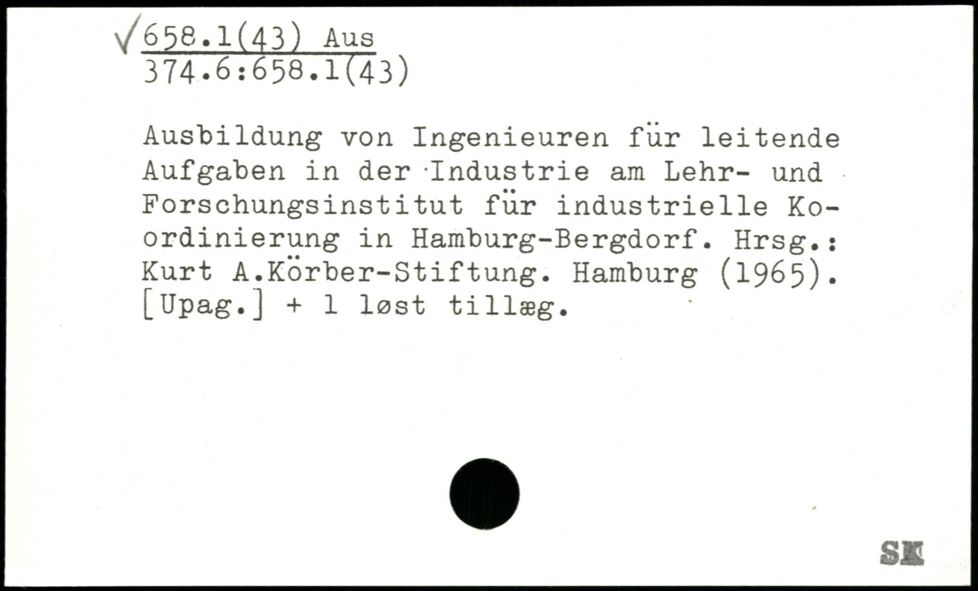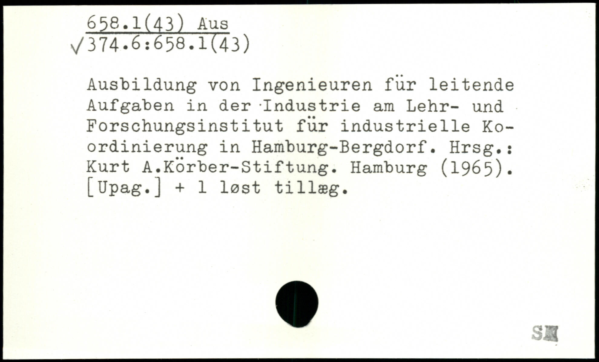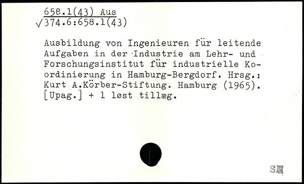 Ausbildung von Ingenieuren für leitende Aufgaben in der -Industrie am Lehr- und Forschungsinstitut für industrielle Koordinierung in Hamburg-Bergdorf. Hrsg.: Kurt A.KÖrber-Stiftung. Hamburg (1965). [üpag.j + 1 lost tillaeg.