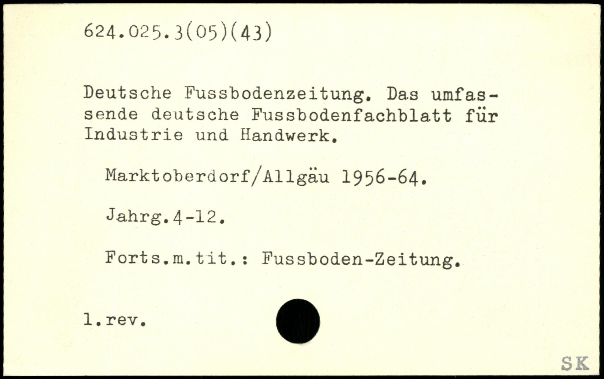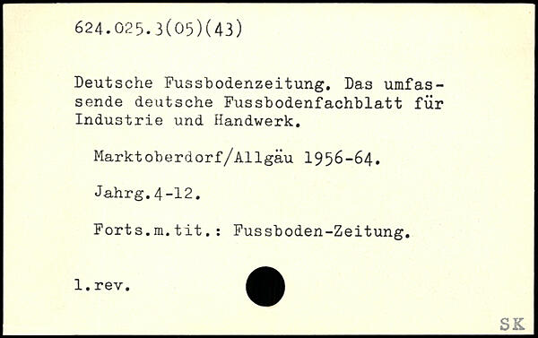 Deutsche Fusshodenzeitung. Das umfassende deutsche Fussbodenfachblatt für Industrie und Handwerk. Marktoberdorf/Allgäu 1956—64. Jahrg.4-12. Forts.m.tit.: Fussboden-Zeitung.