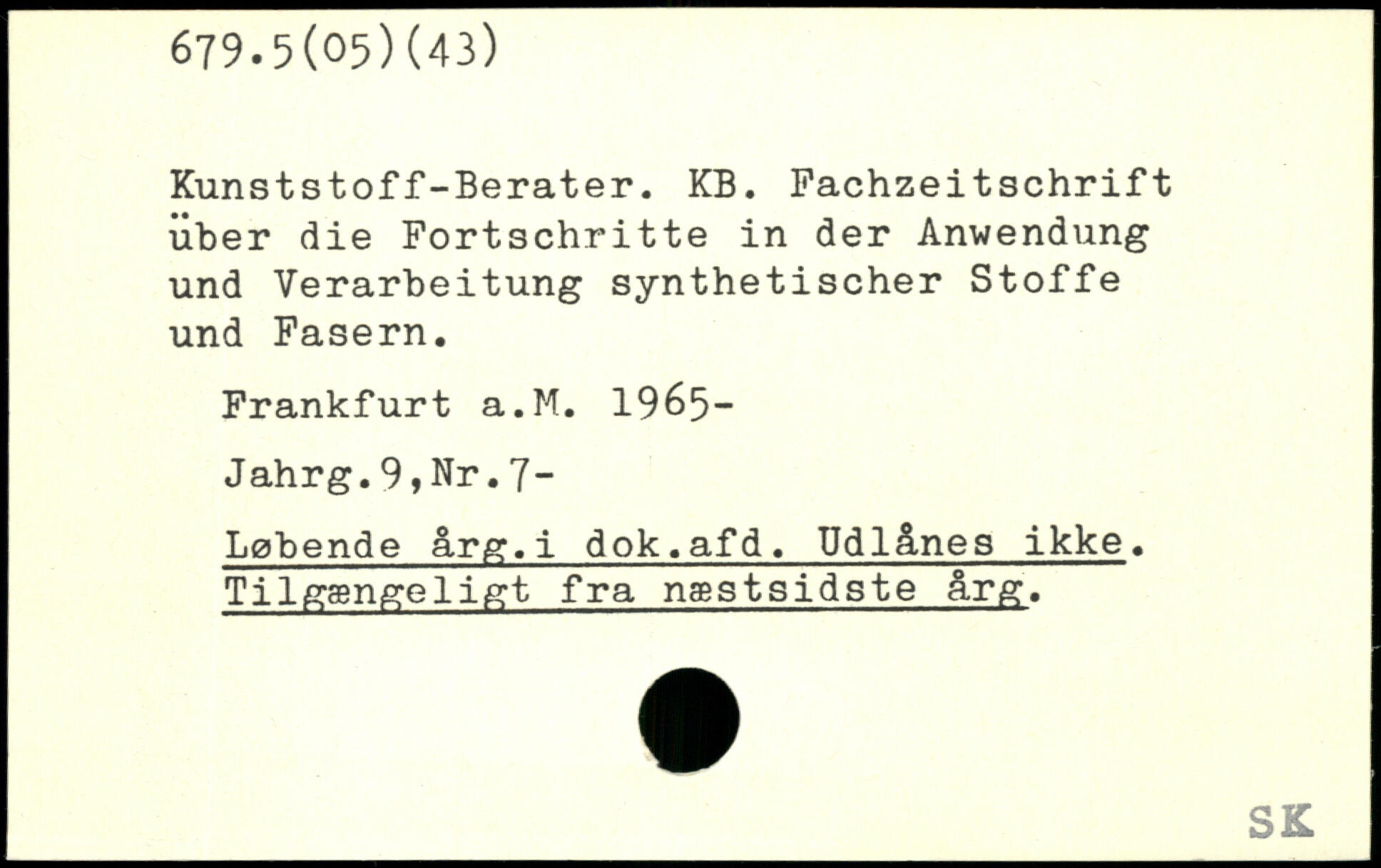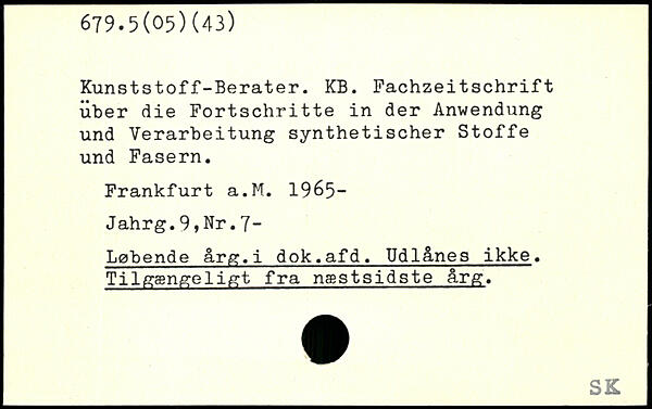 Kunststoff-Berater. KB. Fachzeitschrift über die Fortschritte in der Anwendung und Verarbeitung synthetischer Stoffe und Fasern. Frankfurt a.M. 1965- Jahrg.9,Nr.7- Løbende årg.i dok.afd. Udlånes ikke. Tilgængeligt fra næstsidste årg.