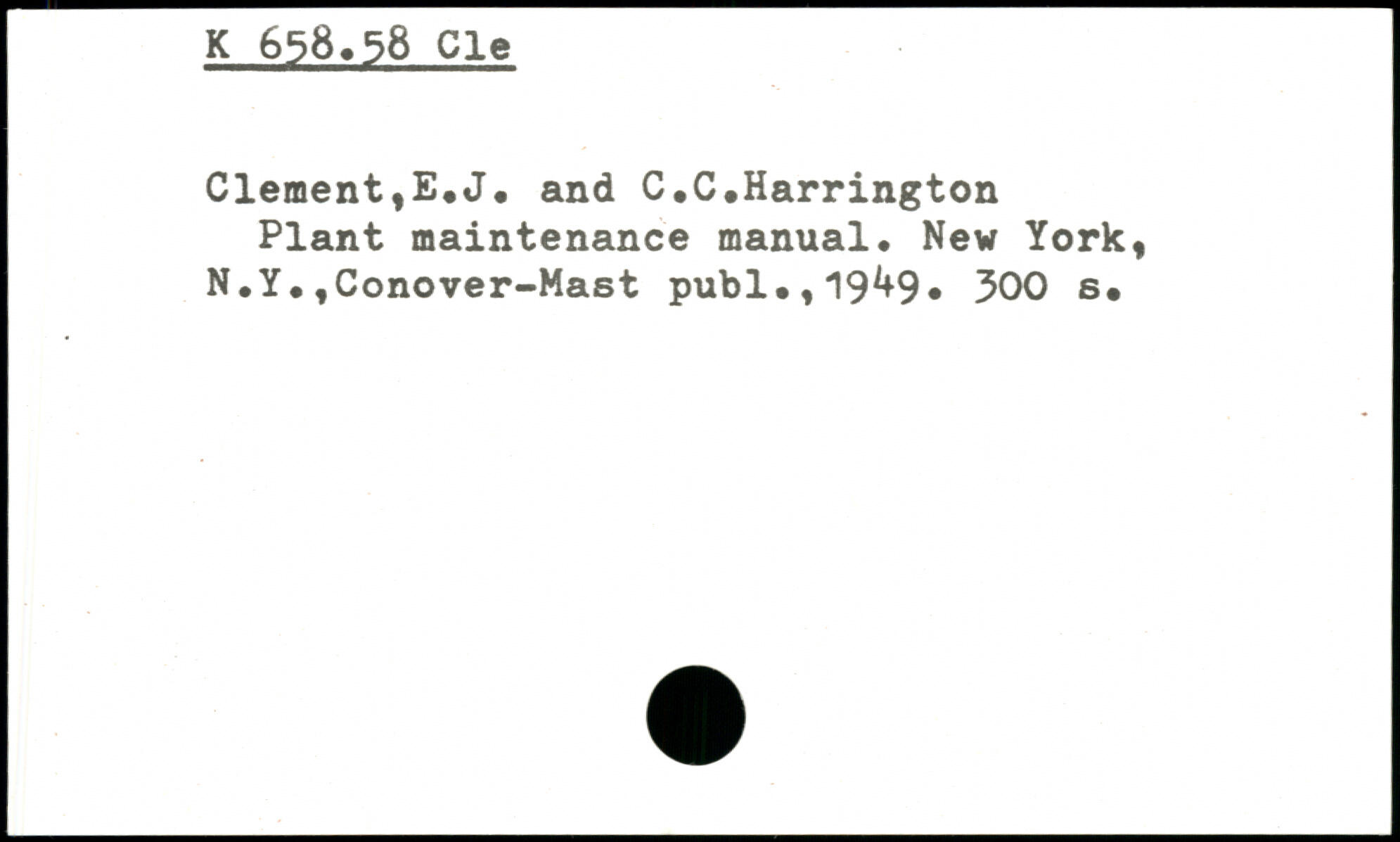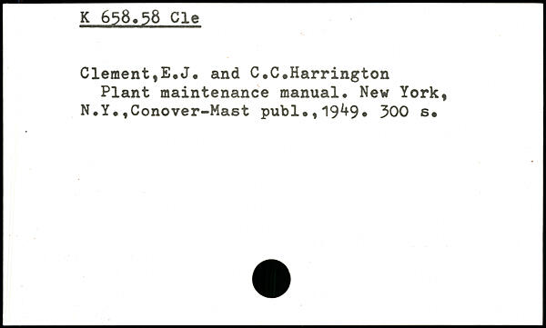 Clement,E.J, and C.C.Harrington Plant maintenance manual# New York, N.Y#,Conover-Mast publ.,19^9