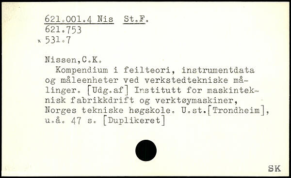 Kompendium i feilteori, instrumentdata og måleenheter ved verkstedtekniske målinger. [Udg.af] Institutt for maskinteknisk fahrikkdrift og verktsymaskiner, Norges tekniske høgskole. U,st.[Trondheim], : u.åo