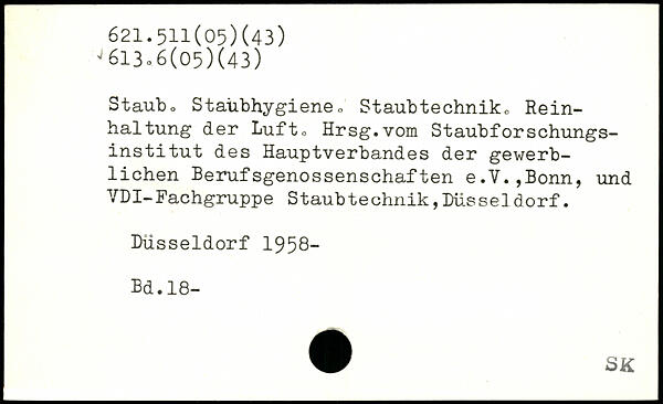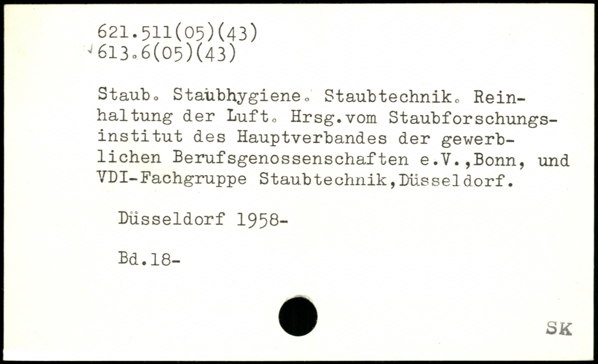 Staubo Staubhygieneo Staubtechniko Reinhaltung der Luft, Hrsg.vom Staubforschungs-institut des Hauptverbandes der gewerblichen Berufsgenossenschaften e.V.,Bonn, und VDI-Fachgruppe Staubtechnik,Düsseidorf. Düsseldorf 1958-