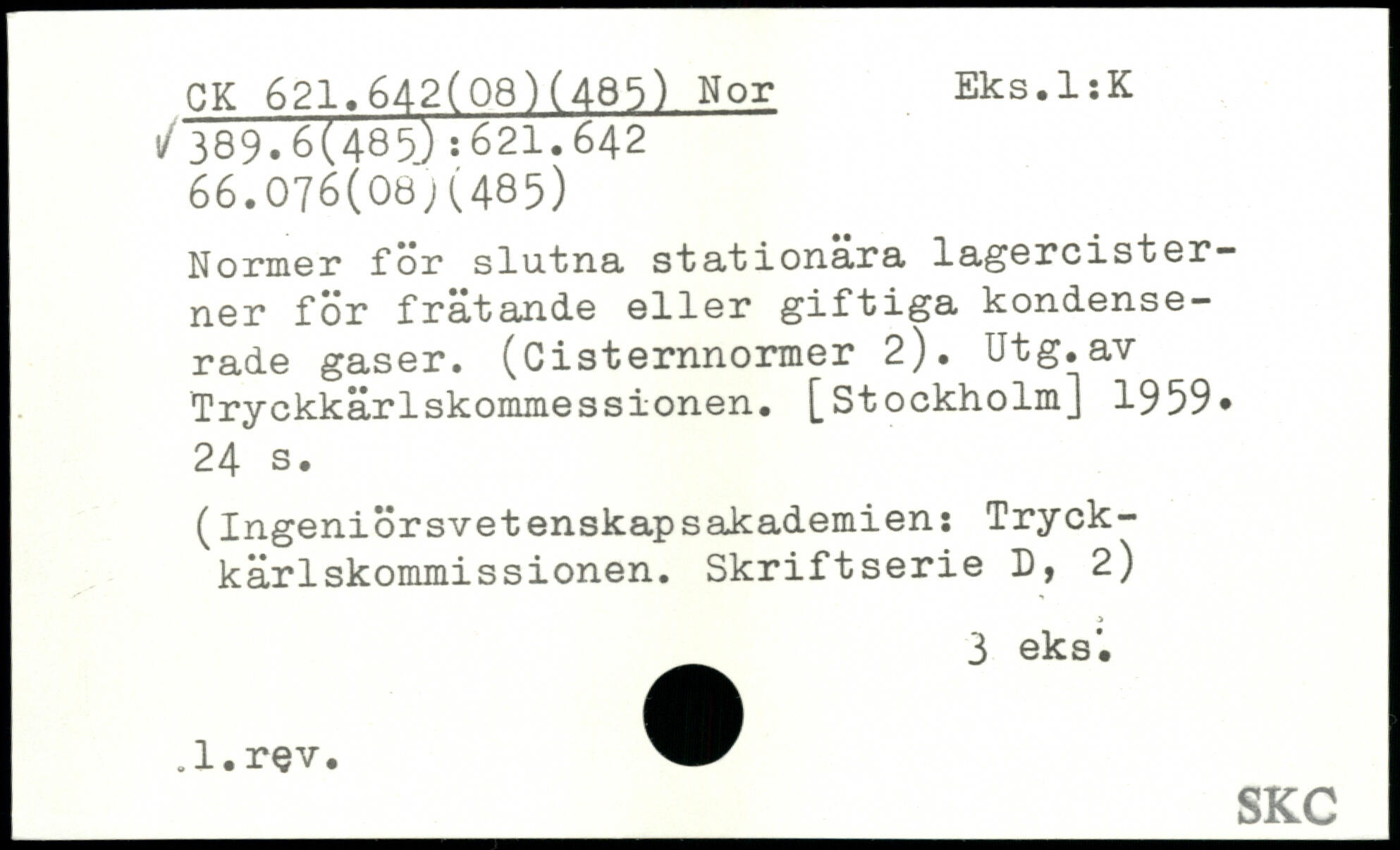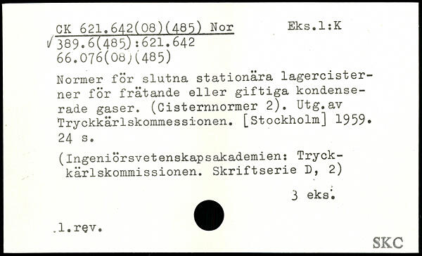 Normer för slutna, stationära lagercister— ner för frätande eller giftiga kondenserade gaser. (Cisternnormer 2). Utg.av Tryckkärlskommessionen.