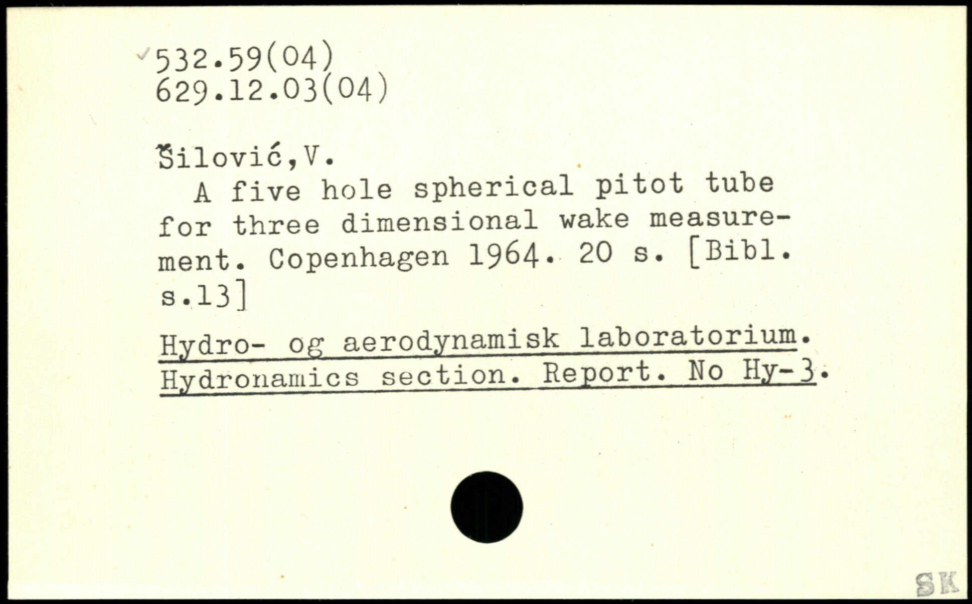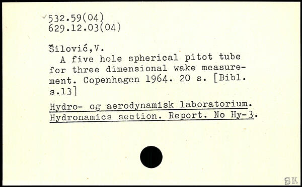 A five hole spherical pitot tube for three dimensional wake measurement.