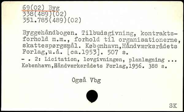 Byggehåndbogen. Tilbudsgivning, kontraktsforhold m.m., forhold til organisationerne, skattespørgsmål. København,Håndværksrådets Forlag,u.å. [ca.1953].