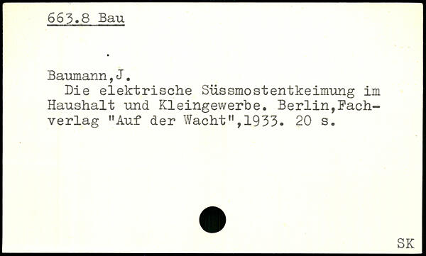 Die elektrische Süssmostentkeimung im Haushalt und Kleingewerbe. Berlin,Fachverlag "Auf der Wacht",1933.