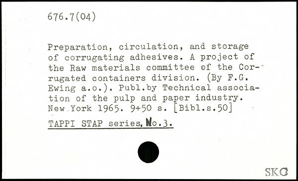 Preparation, circulation, and storage of corrugating adhesives. A project of the Raw materials committee of the Cor-" rugated containers division. (By F.G. Ewing a.o.).