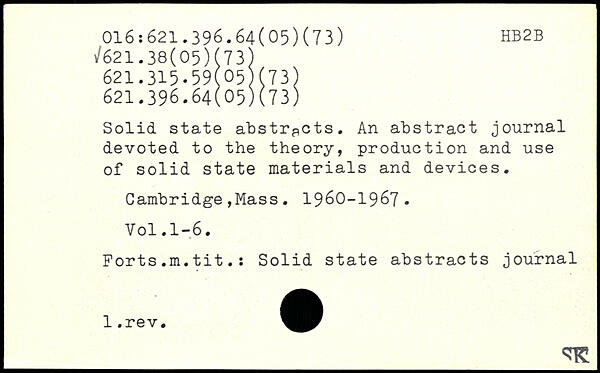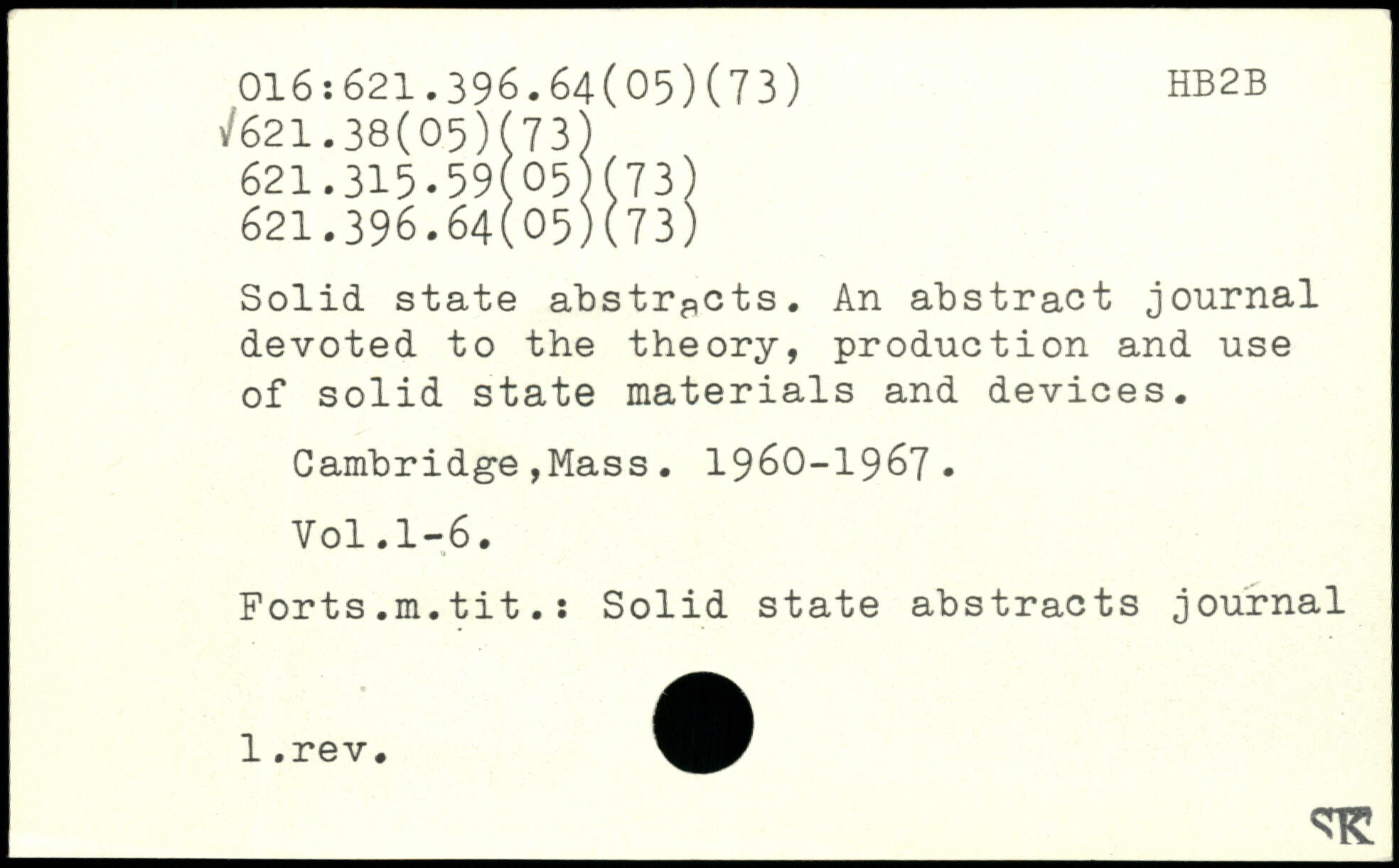 Solid state abstracts. An abstract journal devoted to the theory, production and use of solid state materials and devices. Cambridge,Mass. 1960-1967.