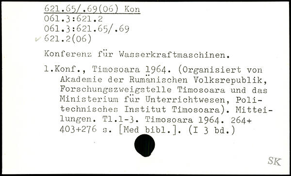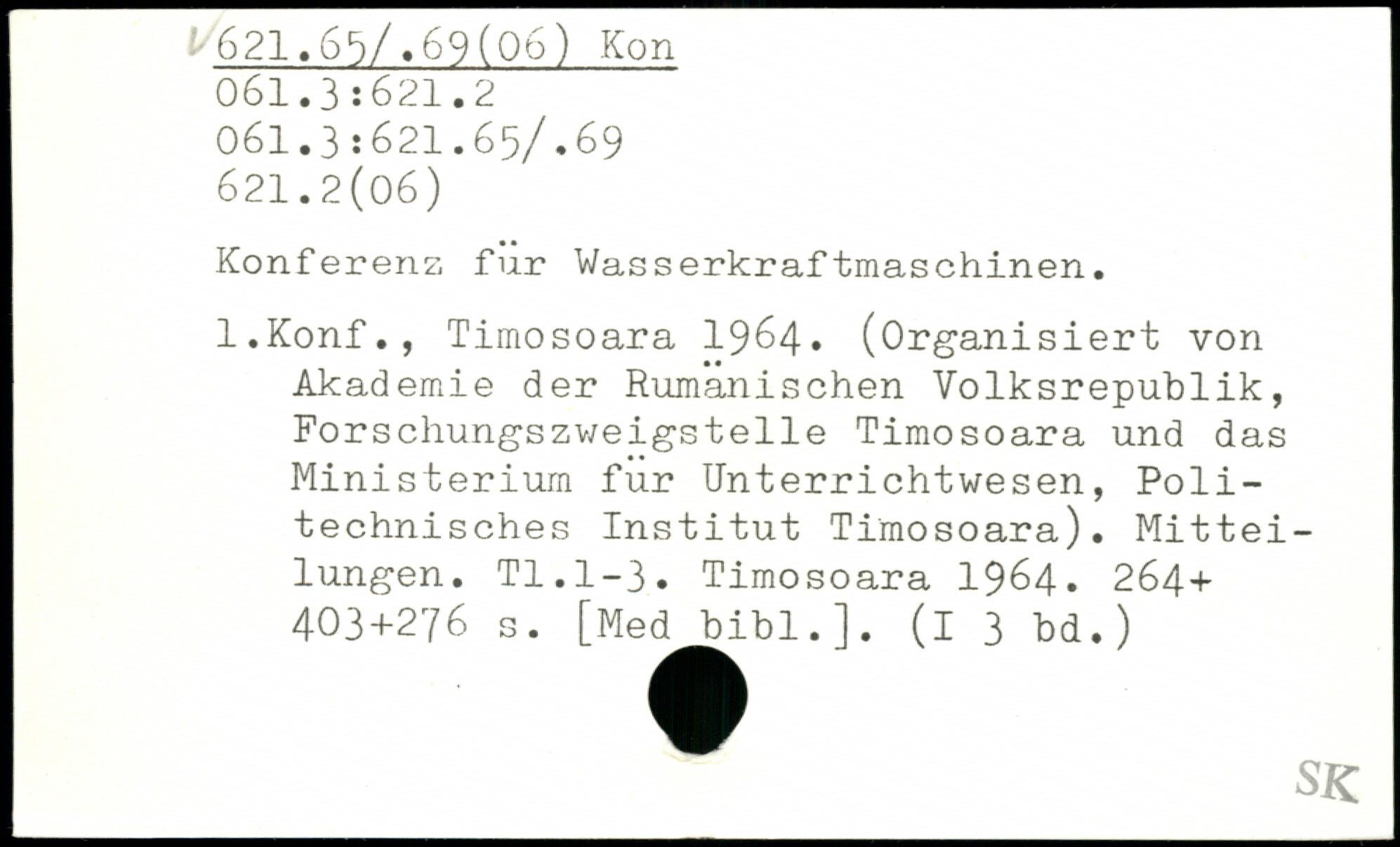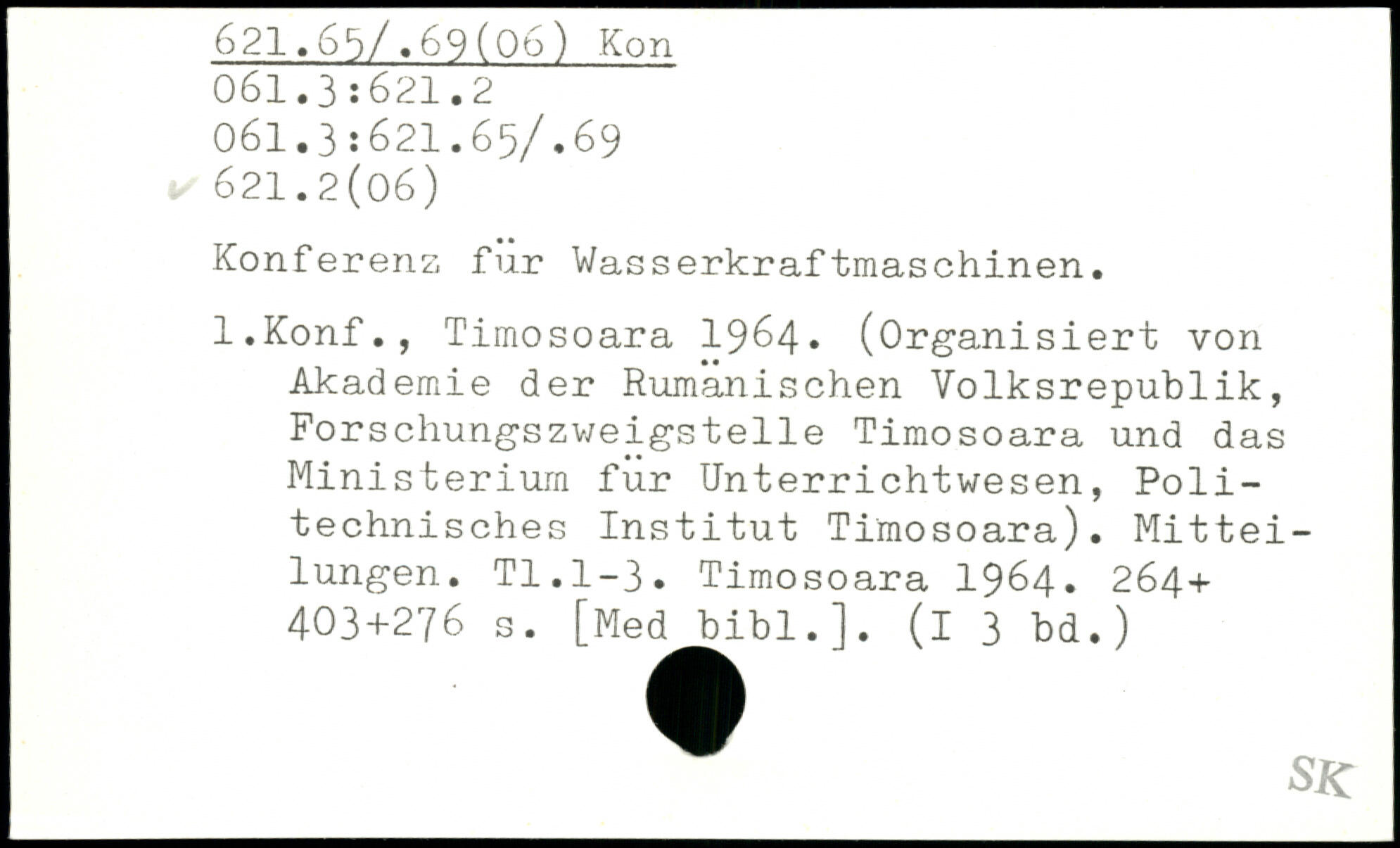 Konferenz für Wasserkraftmaschinen. l.Konf., Timosoara 1964. (Organisiert von Akademie der Rumänischen Volksrepublik, Forschungszweigstelle Timosoara und das Ministerium für Unterrichtwesen, Poli-technisches Institut Timosoara). Mitteilungen. TI.1-3. Timosoara 1964. 264+