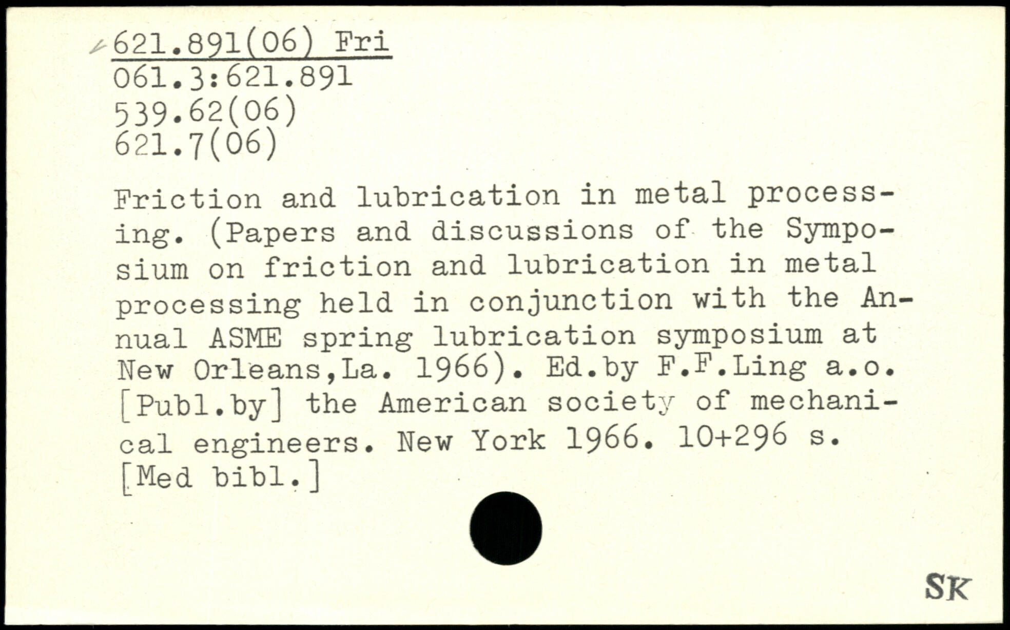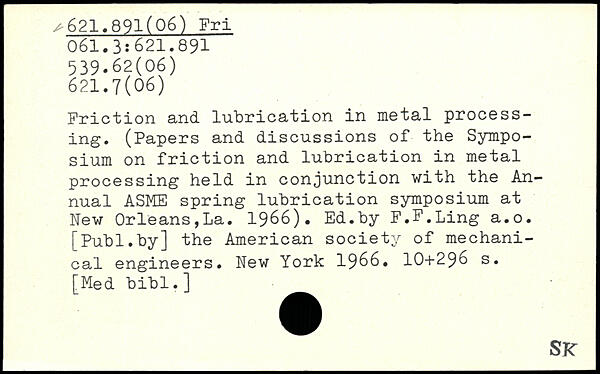 Friction and lubrication in metal processing. (Papers and discussions of the Symposium on friction and lubrication in metal processing held in conjunction with the Annual ASME spring lubrication symposium at Few Orleans,La. 1966). Ed.by F.F.Ling a.o.