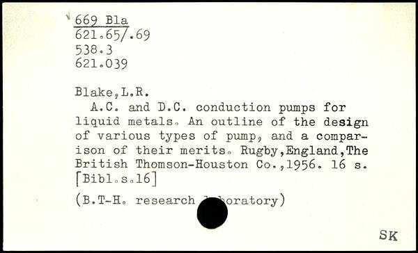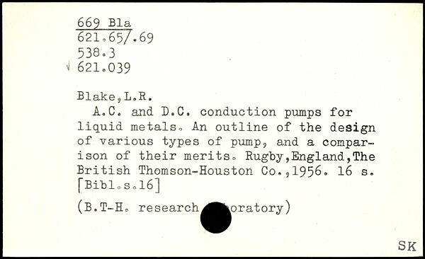 A.C. and D.C. conduction pumps for liquid metals. An outline of the design of various types of pump9 and a comparison of their merits. Rugby,England,The British Thomson-Rouston Co..1956.
