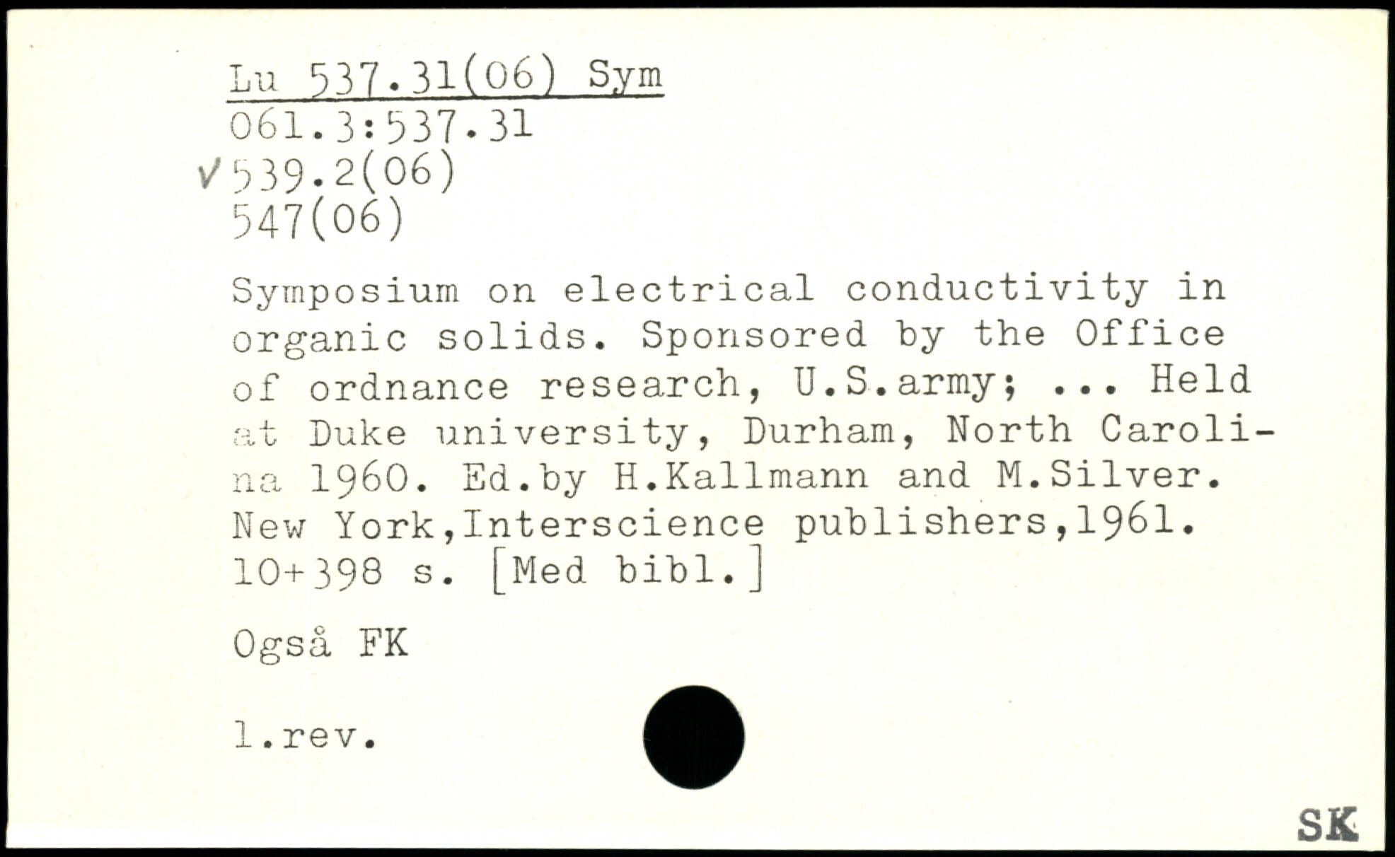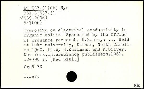 Symposium on electrical conductivity in organic solids. Sponsored by the Office of ordnance research, U.S.army; ... Held at Duke university, Durham, North Carolina 1960. Ed.by H.Kallmann and M.Silver.