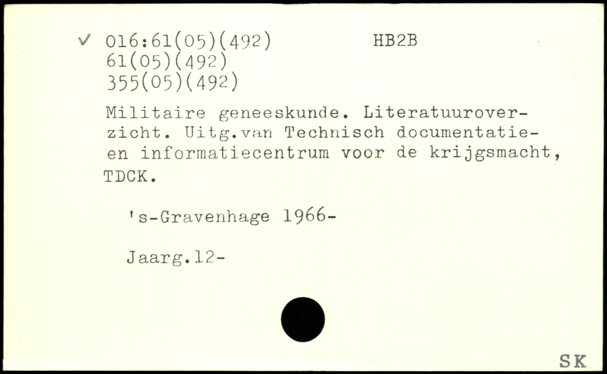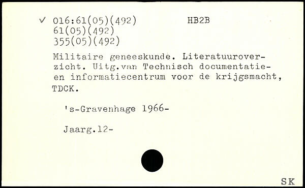 Militaire geneeskunde. Literatuurover-zicht. Uitg.van Technisch documentatie-en informatiecentrum voor de krijgsmacht, TDCK. 1s-Gravenhage 1966-Jaarg.12-
