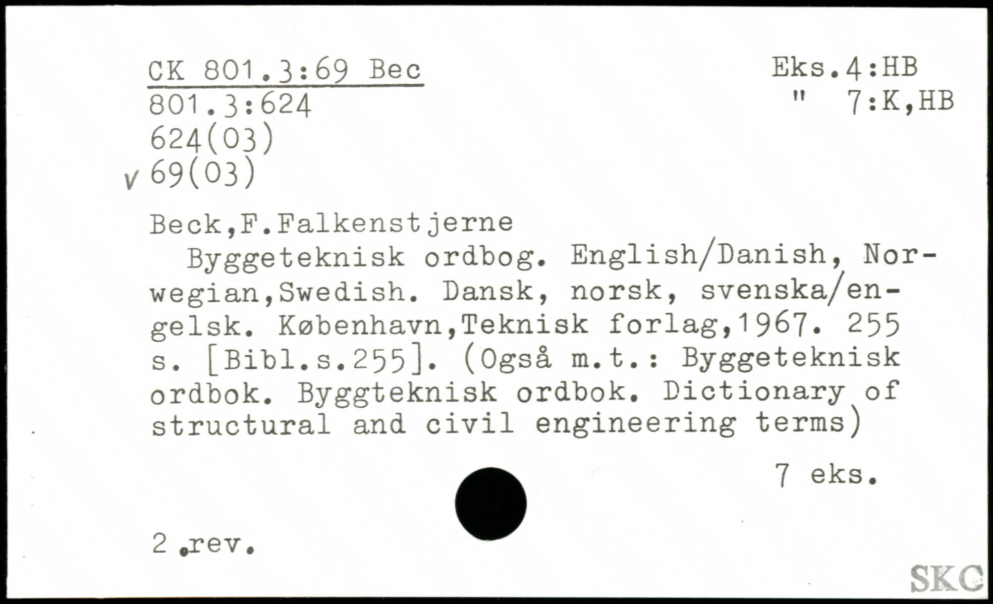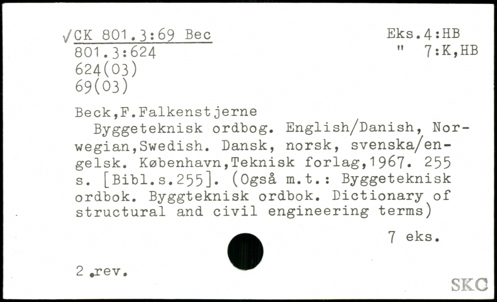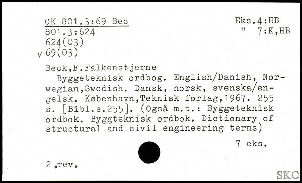Beck,F.Falkenst jerne Byggeteknisk ordbog. English/Danish, Norwegian, Swedish. Dansk, norsk, svenska/en-gelsk.