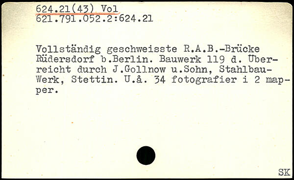 Vollständig geschweisste R.A.B.-Brücke Rüdersdorf b.Berlin. Bauwerk 119 d. Überreicht durch J.Gollnow u.Sohn, Stahlbau-Werk, Stettin. U.&. 34 fotografier i 2 map-per.