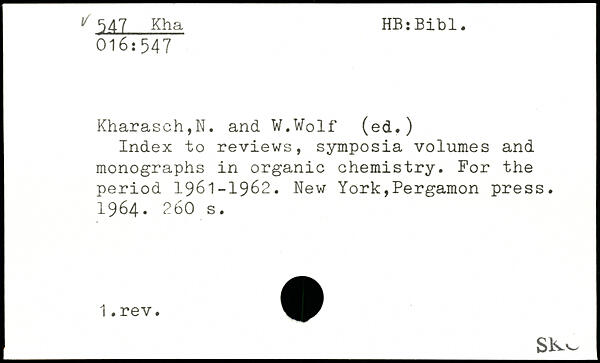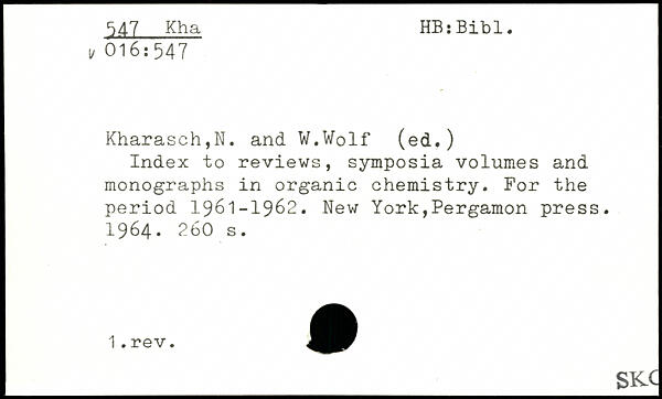 Index to reviews, symposia volumes and monographs in organic chemistry. For the period 1961-1962. New York,Pergamon press. 1964.
