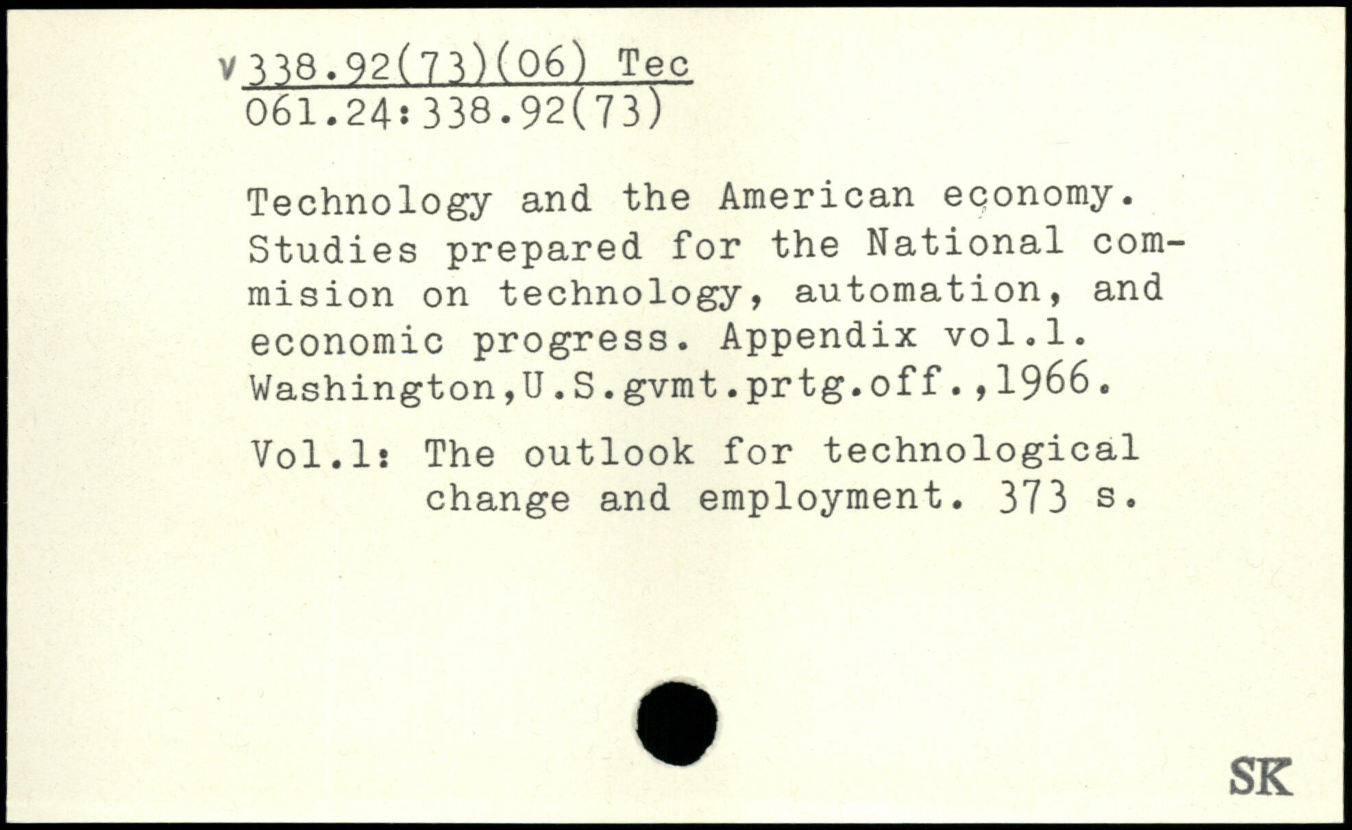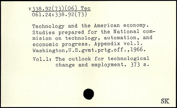 Technology and the American economy. Studies prepared for the National commision on technology, automation, and economic progress. Appendix vol.l. Washington,U.S.gvmt.prtg.off.,1966. Vol.l! The outlook for technological change and employment.
