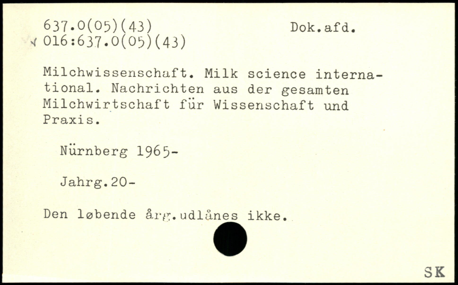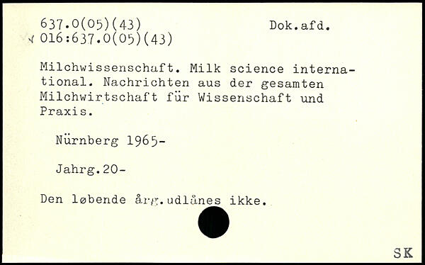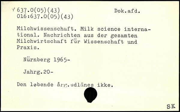 Milchwissenschaft. Milk science international. Nachrichten aus der gesamten Milchwirtschaft für Wissenschaft und Praxi s. Nürnberg 1965-Jahrg.20- Den løbende årg.udlånes ikke. ______