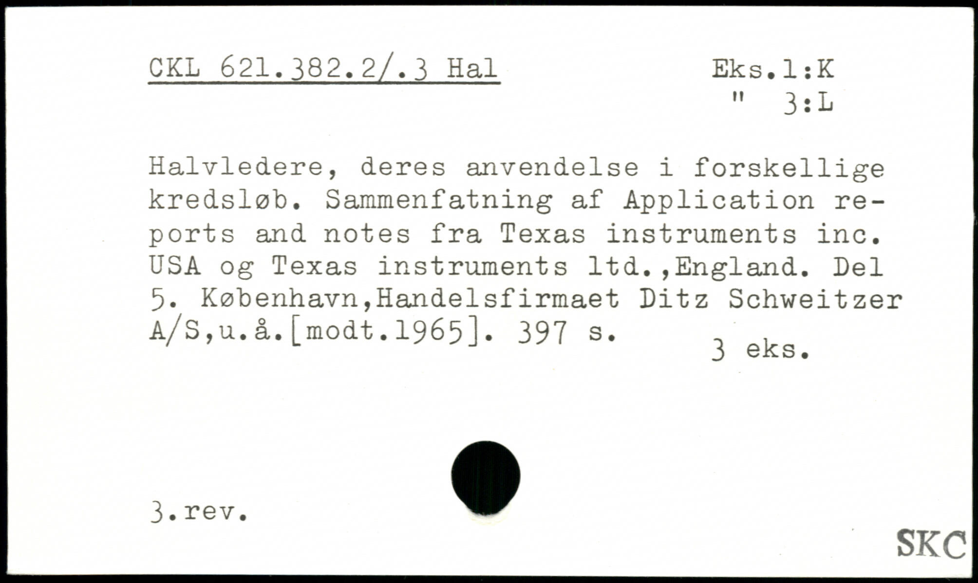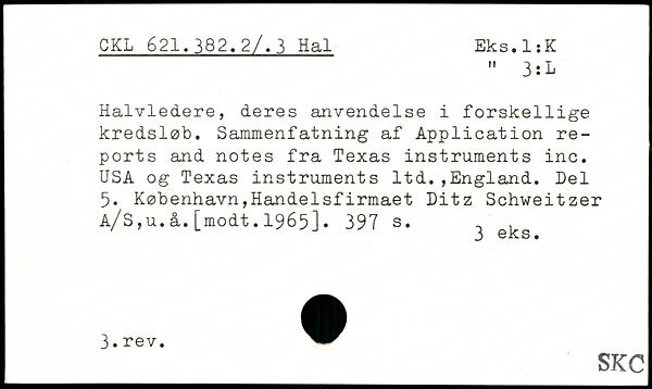 Halvledere, deres anvendelse i forskellige kredsløb. Sammenfatning af Application reports and notes fra Texas instruments inc. USA og Texas instruments ltd.,England. Del 5. København,Handelsfirmaet Ditz Schweitzer A/S,u.å.[modt.1965].