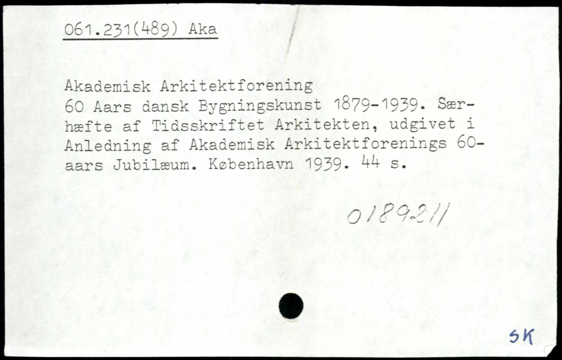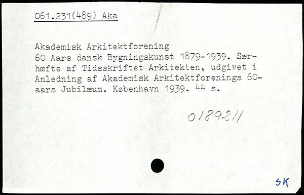 Akademisk Arkitektforening 60 Aars dansk Bygningskunst 1879-1939. Særhæfte af Tidsskriftet Arkitekten, udgivet i Anledning af Akademisk Arkitektforenings 60-aars Jubilæum.