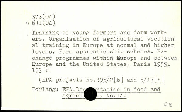 Training of young farmers and farm workers o Organisation of agricultural vocational training in Europe at normal and higher levels, Farm apprenticeship schemes, Exchange programmes within Europe and between Europe and the United States