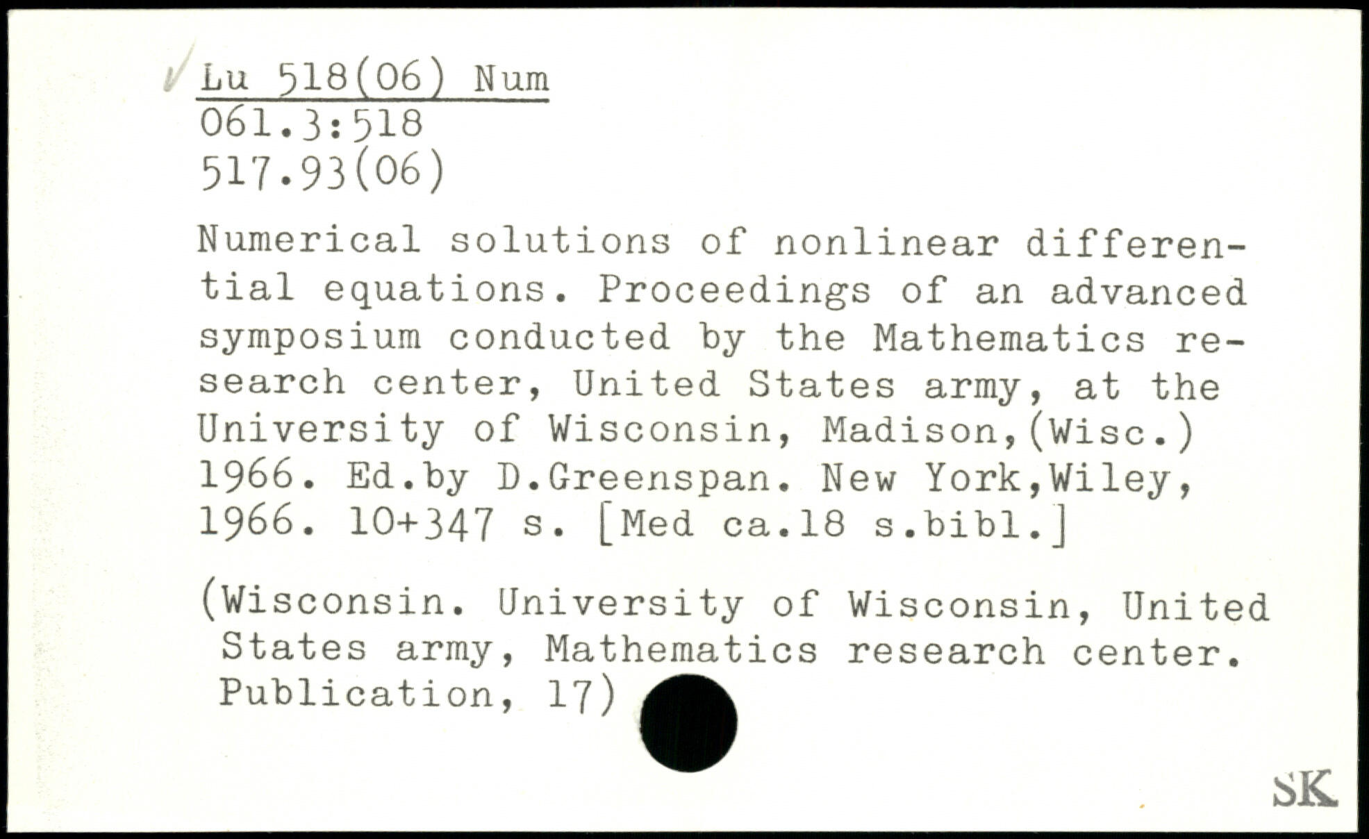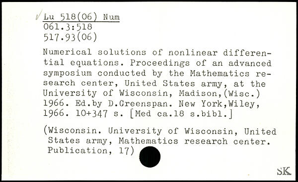 Numerical solutions of nonlinear differential equations. Proceedings of an advanced symposium conducted by the Mathematics research center, United States army, at the University of Wisconsin, Madison,(Wise.) 1966. Ed.by D.Greenspan.