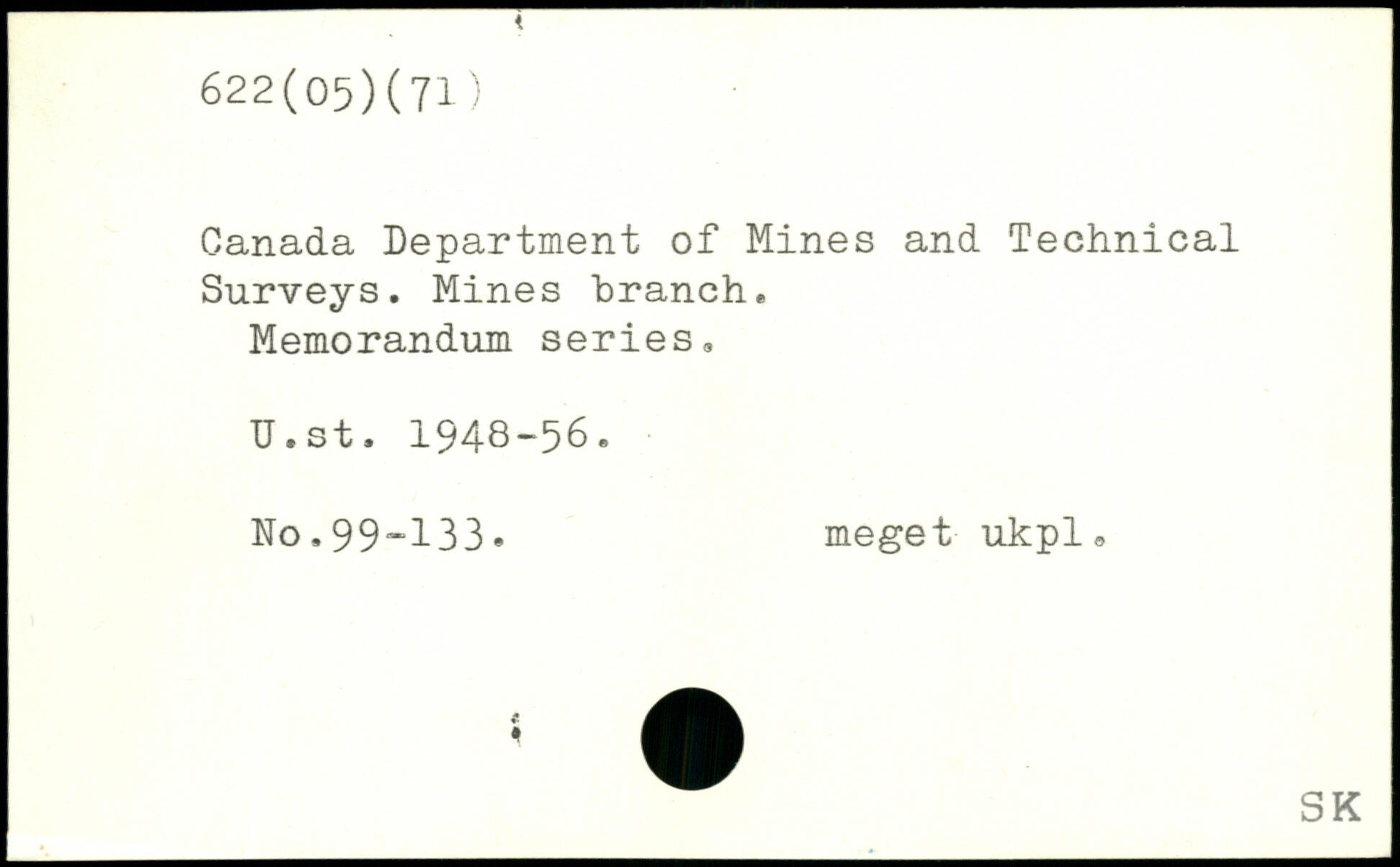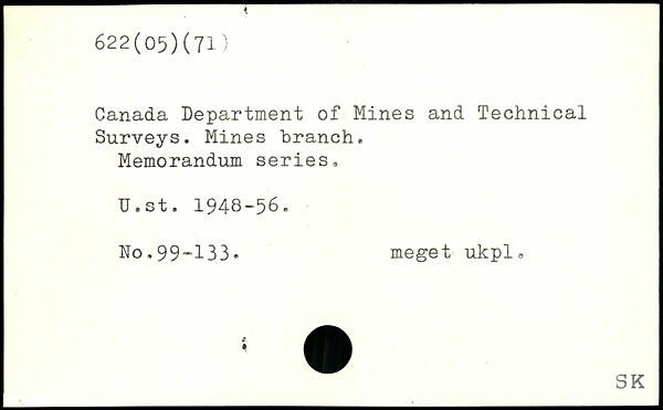 Canada Department of Mines and Technical Surveys. Mines branch. Memorandum series, U.st. 1948-56. No,99-133, meget ukpl, 1.