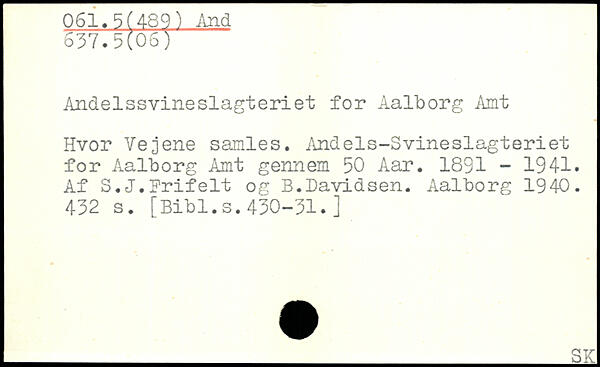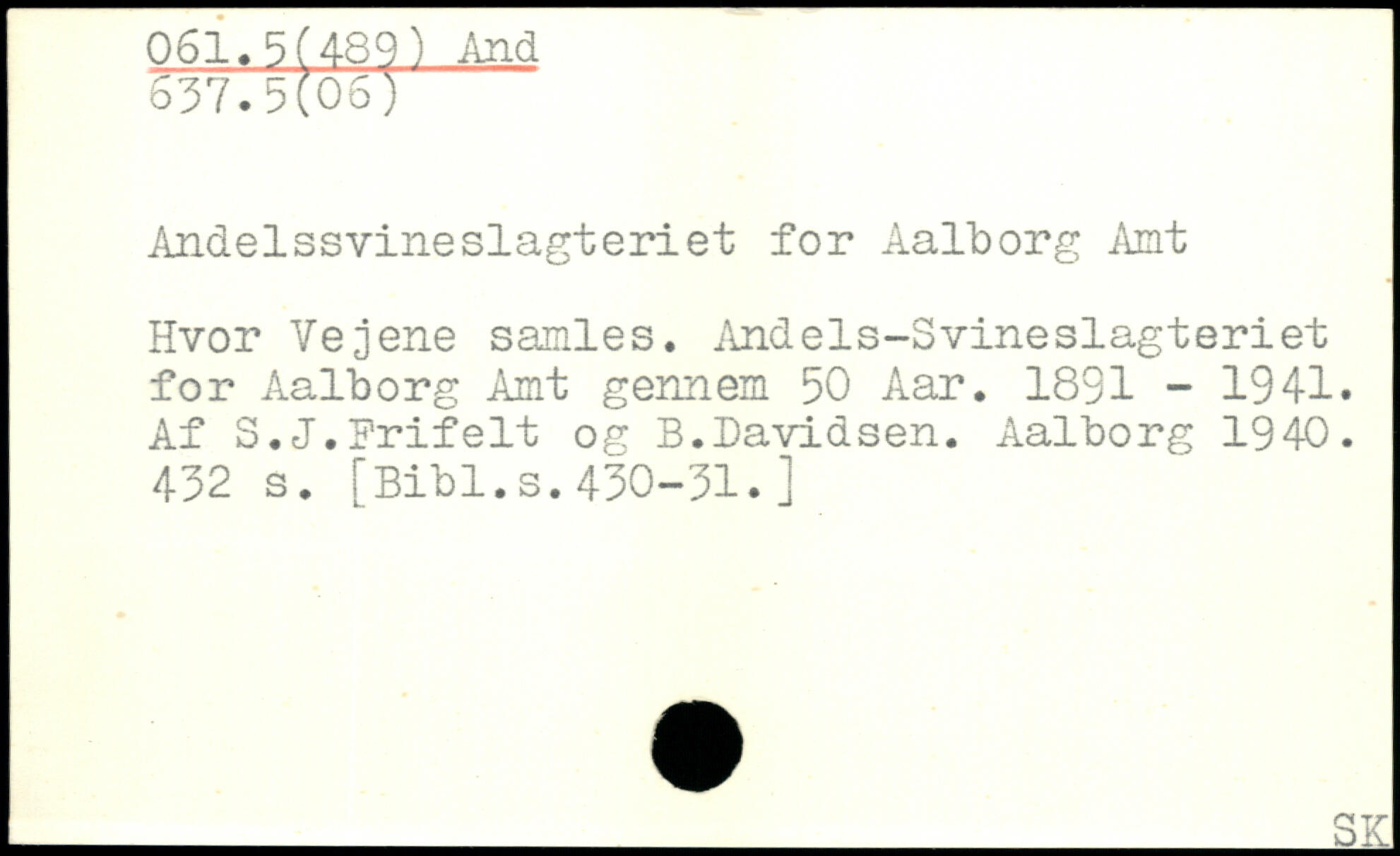 Andelssvineslagteriet for Aalborg Amt Hvor Vejene samles. Andels-Svineslagteriet for Aalborg Amt gennem 50 Aar. 1891 - 1941. Af S.J.Frifelt og B.Davidsen.