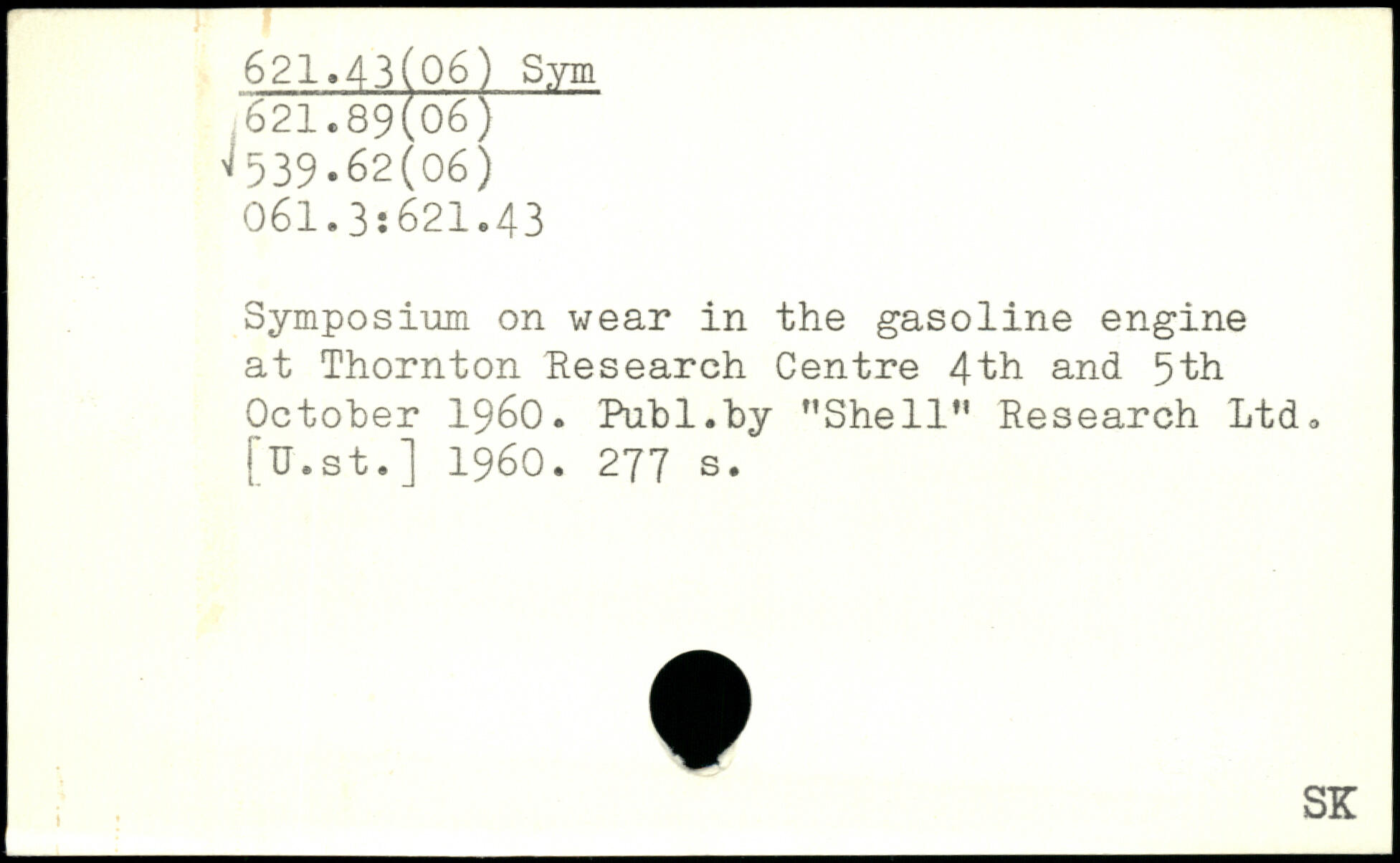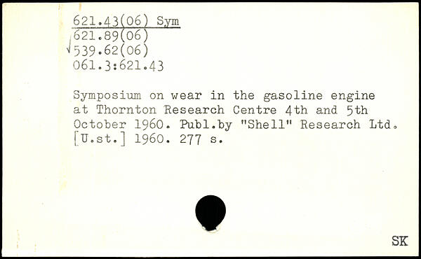 Symposium on wear in the gasoline engine at Thornton Research Centre 4th and 5th October 1960. Pnbl.hy "Shell” Research Ltd.