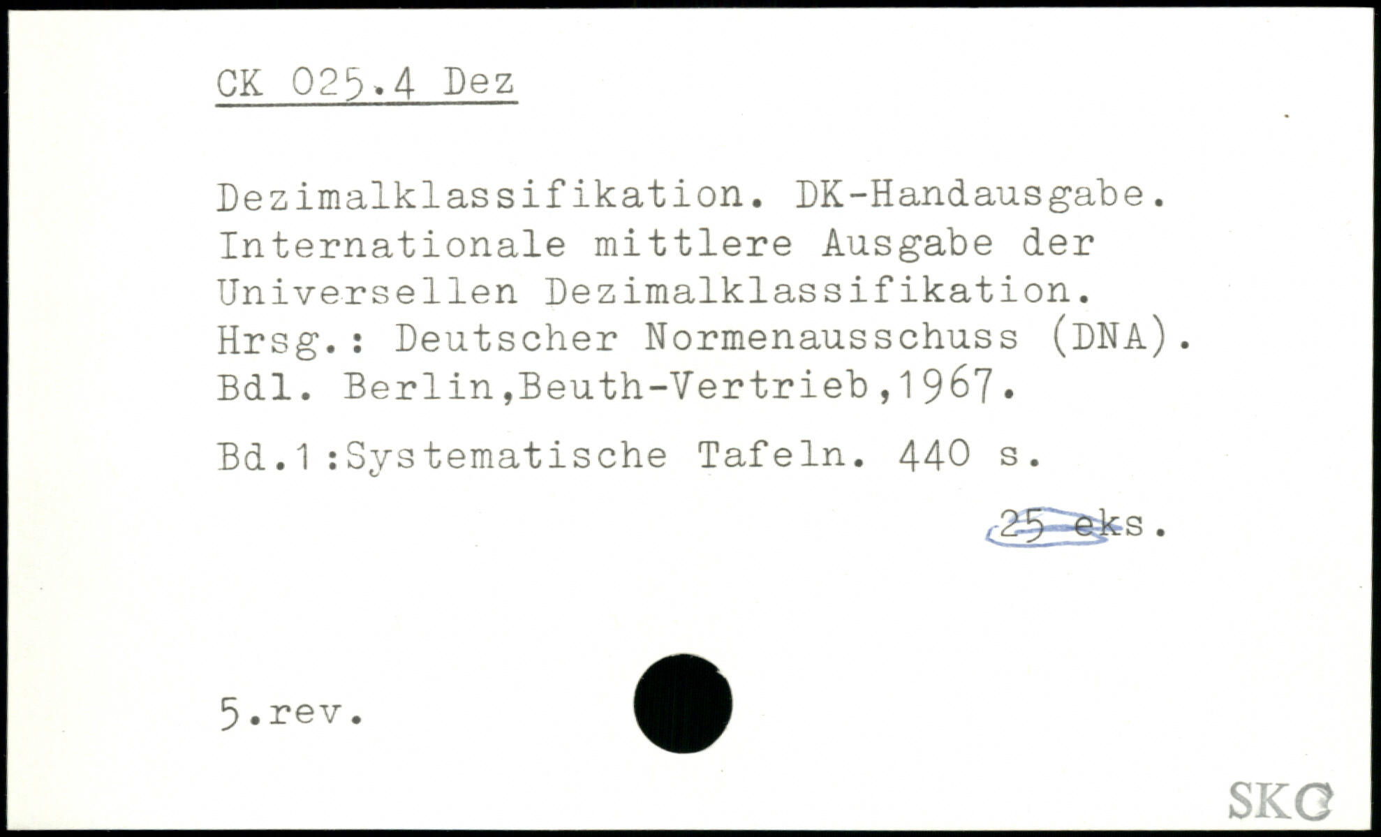 Dezimalklassifikation. DK-Handausgabe. Internationale mittlere Ausgabe der Universellen Dezimalklassifikation. Hrsg.: Deutscher Normenausschuss (DNA). Bdl.