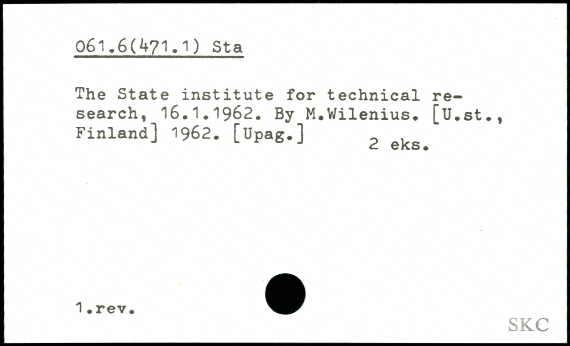 The State institute for technical research, 16.1.1962. By M.Wilenius.