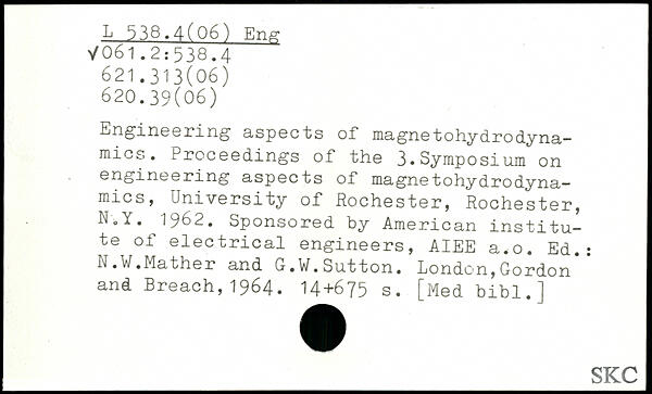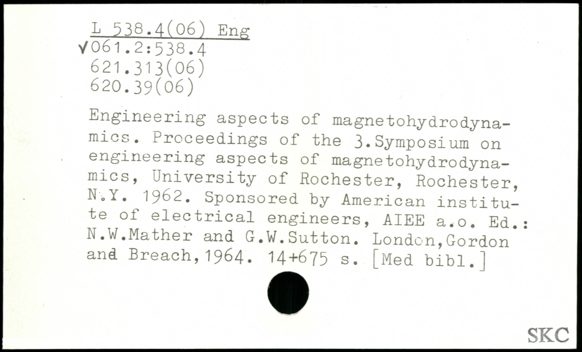 Engineering aspects of magnetohydrodynamics. Proceedings of the 3.Symposium on engineering aspects of magnetohydrodyna-mics, University of Rochester, Rochester, N.Y. 1962. Sponsored by American institute of electrical engineers, AIEE a.o. Ed.: N.W.Mather and G.W.Sutton.
