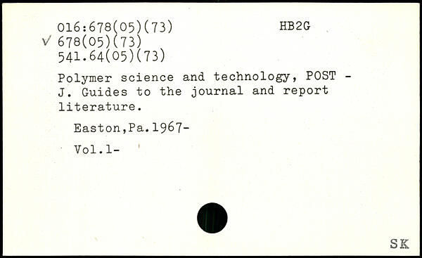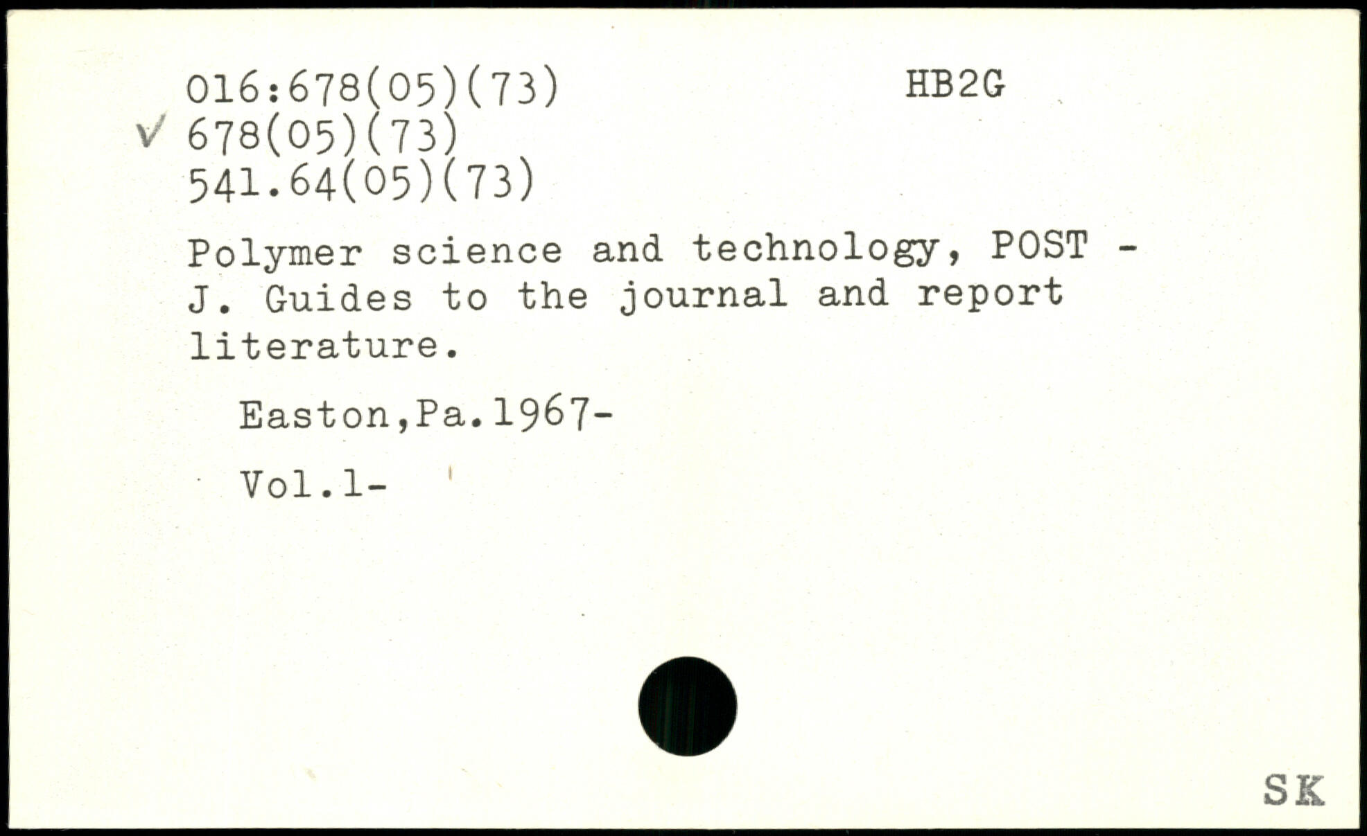 Polymer science and technology, POST -J. Guides to the journal and report literature. Easton,Pa.1967- Vol.l- '