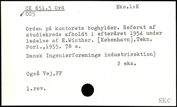 Orden på kontorets boghylder. Referat af studiekreds afholdt i efteråret 1954 under ledelse af E.Vinther. [København],Tekn. Forl.,1955.