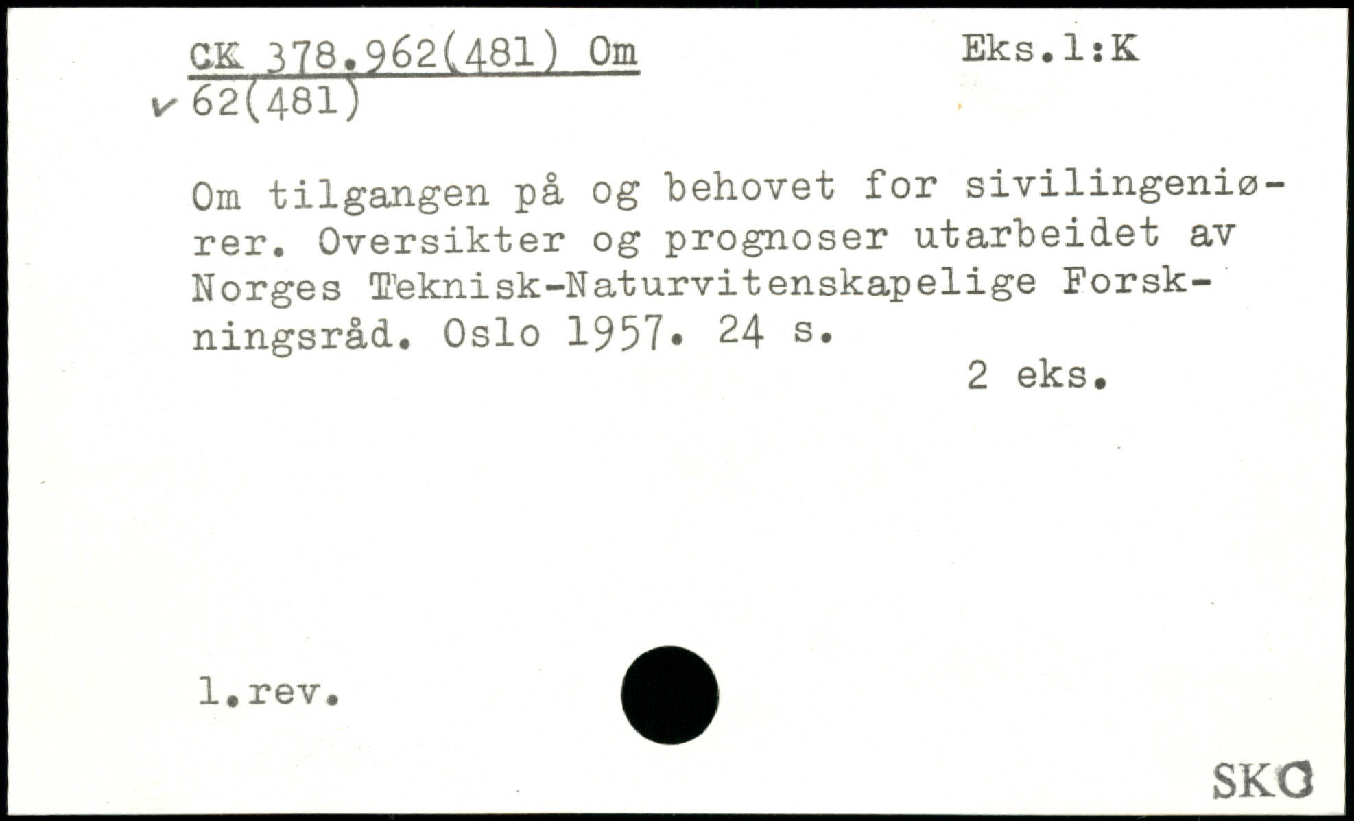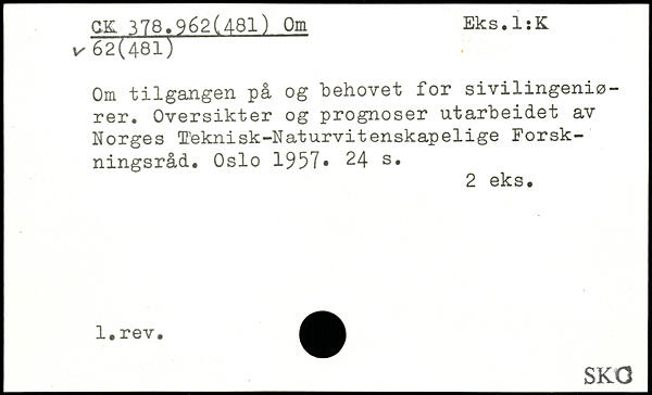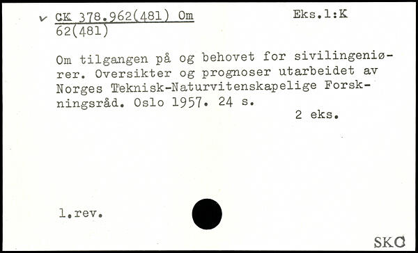 Om tilgangen på og behovet for sivilingeniø-rer. Oversikter og prognoser utarbeidet av Norges teknisk-Naturvitenskapelige Forskningsråd. Oslo 1957