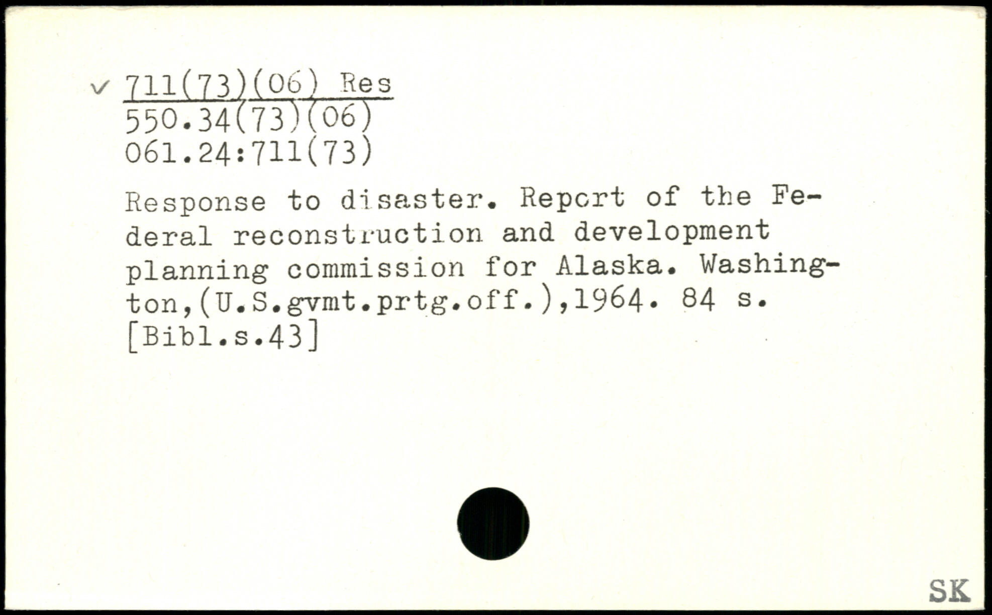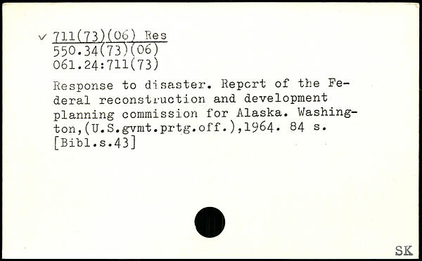 Response to disaster. Report of the Federal reconstruction and development planning commission for Alaska. Washing-ton, (TJ.S.gvmt.prtg.off.) ,1964